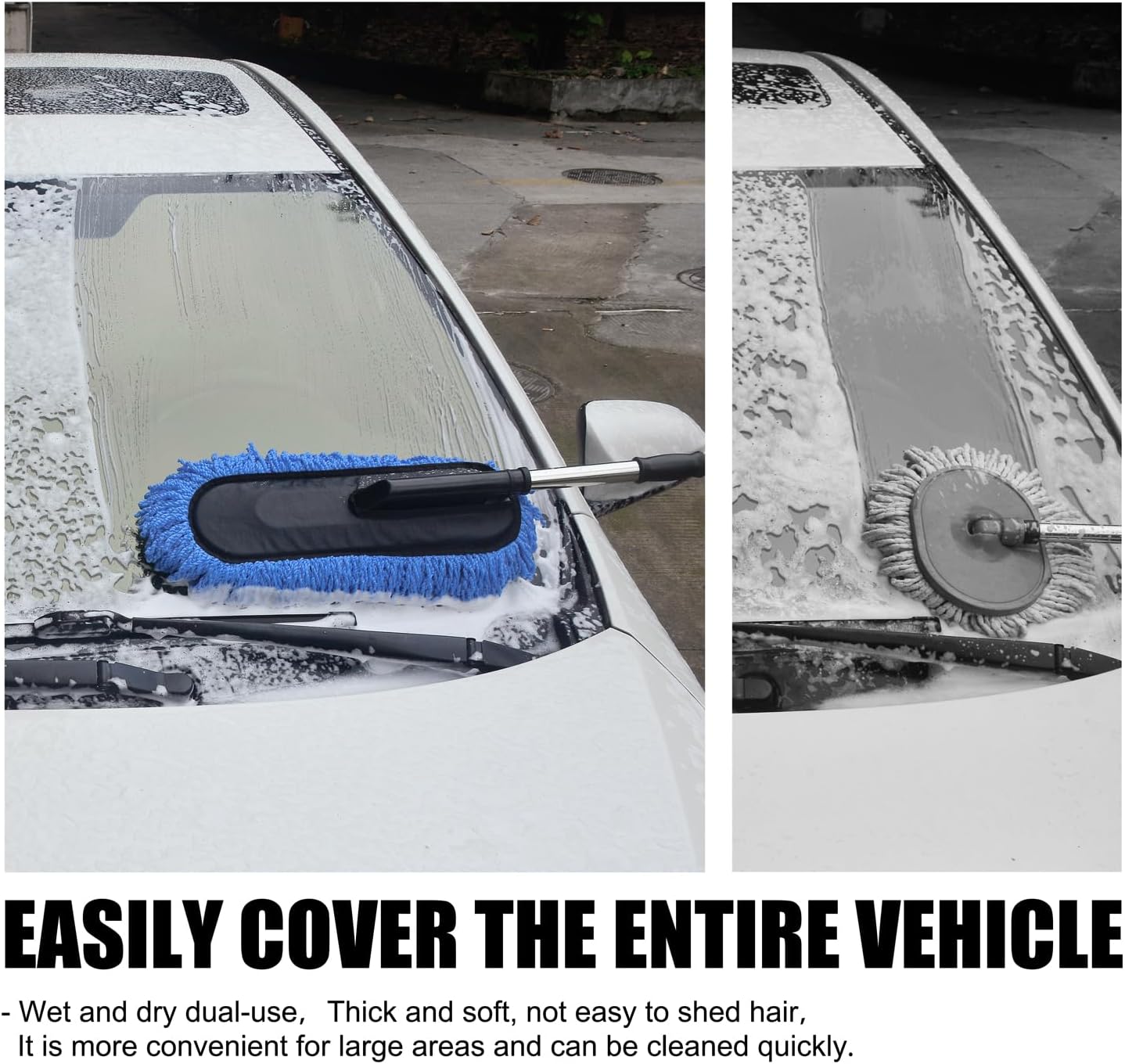 - 1. Efficient Large-Scale Cleaning Features an extra-wide wash mop head that covers more surface area than ordinary ones, enabling you to clean your entire vehicle quickly and efficiently.