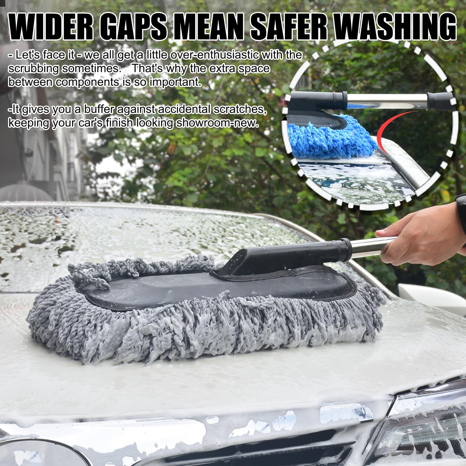 - 4. User-Friendly & Durable Design Built to last with a reusable and machine-washable design. The lightweight, extendable stainless steel handle is anti-slip and comfortable to use, providing a secure grip while protecting your car's finish from scratches.