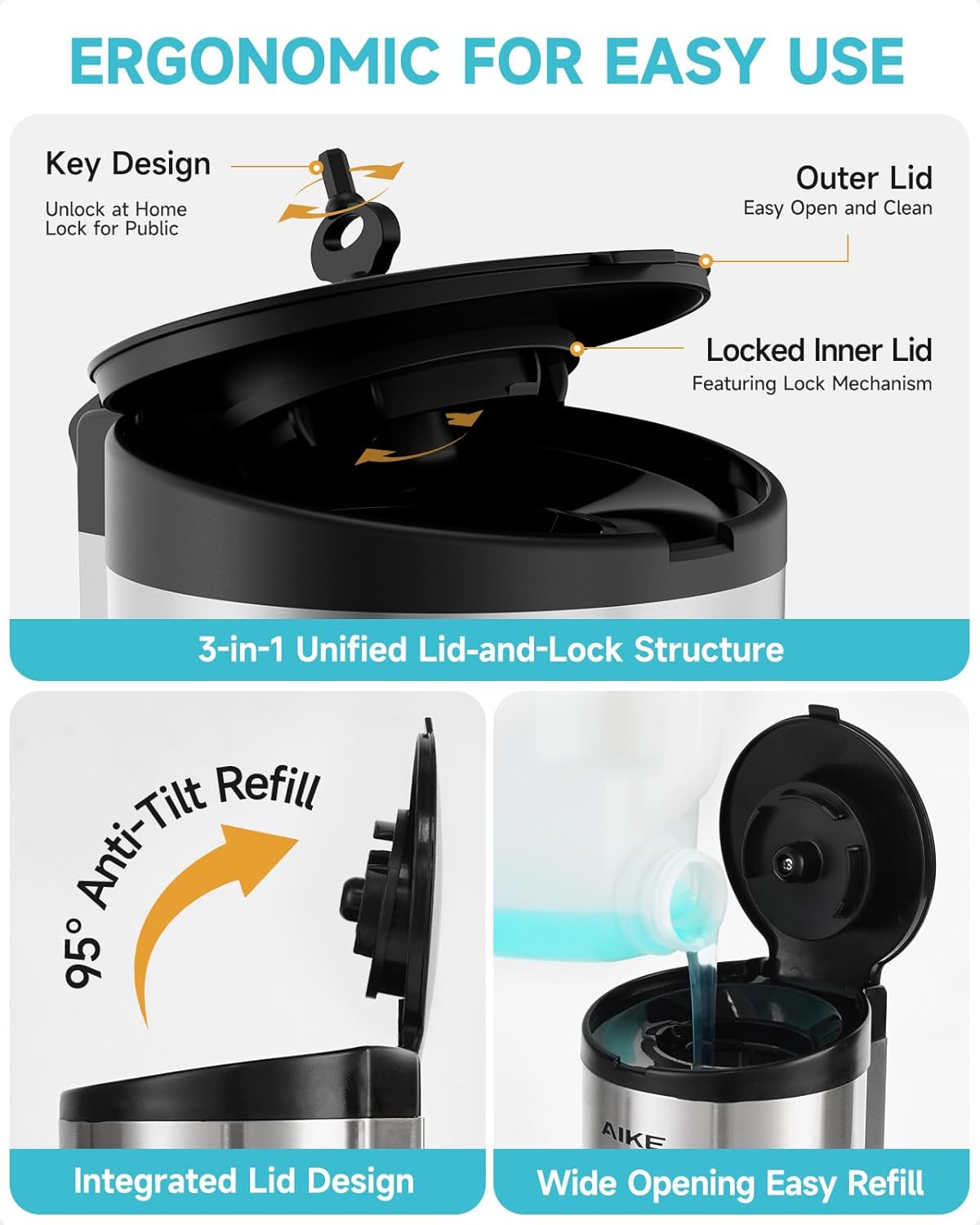 - Ergonomic design—3-in-1 integrated lid-lock mechanism for simultaneous locking. The 95-degree one-piece lid prevents liquid tipping during filling