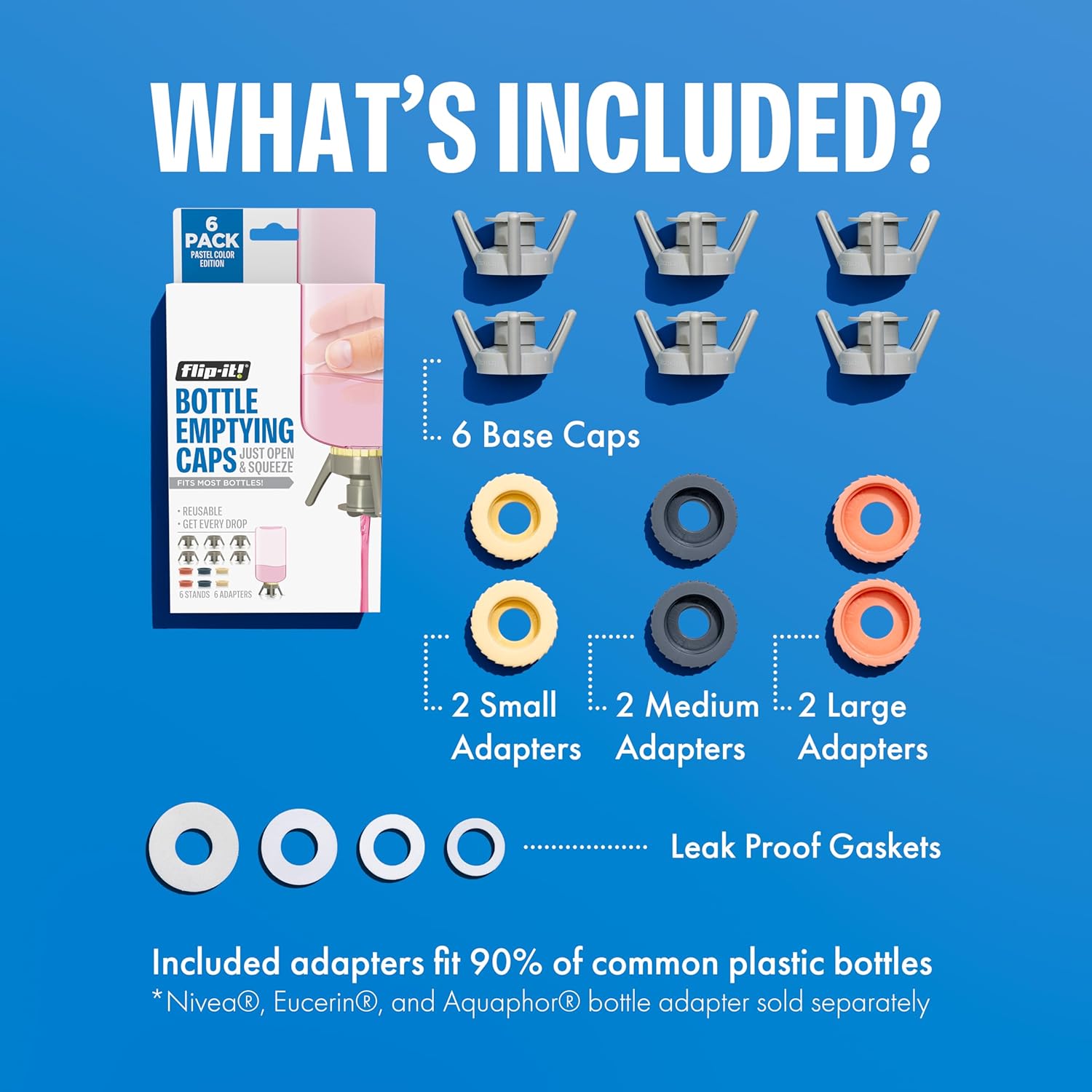 Flip-It! Bottle Emptying Kit – 6 Bottle Pack - No more wasted product - Fits most plastic bottles – 6 Base Caps, 6 Adapters – Pastel Color Edition