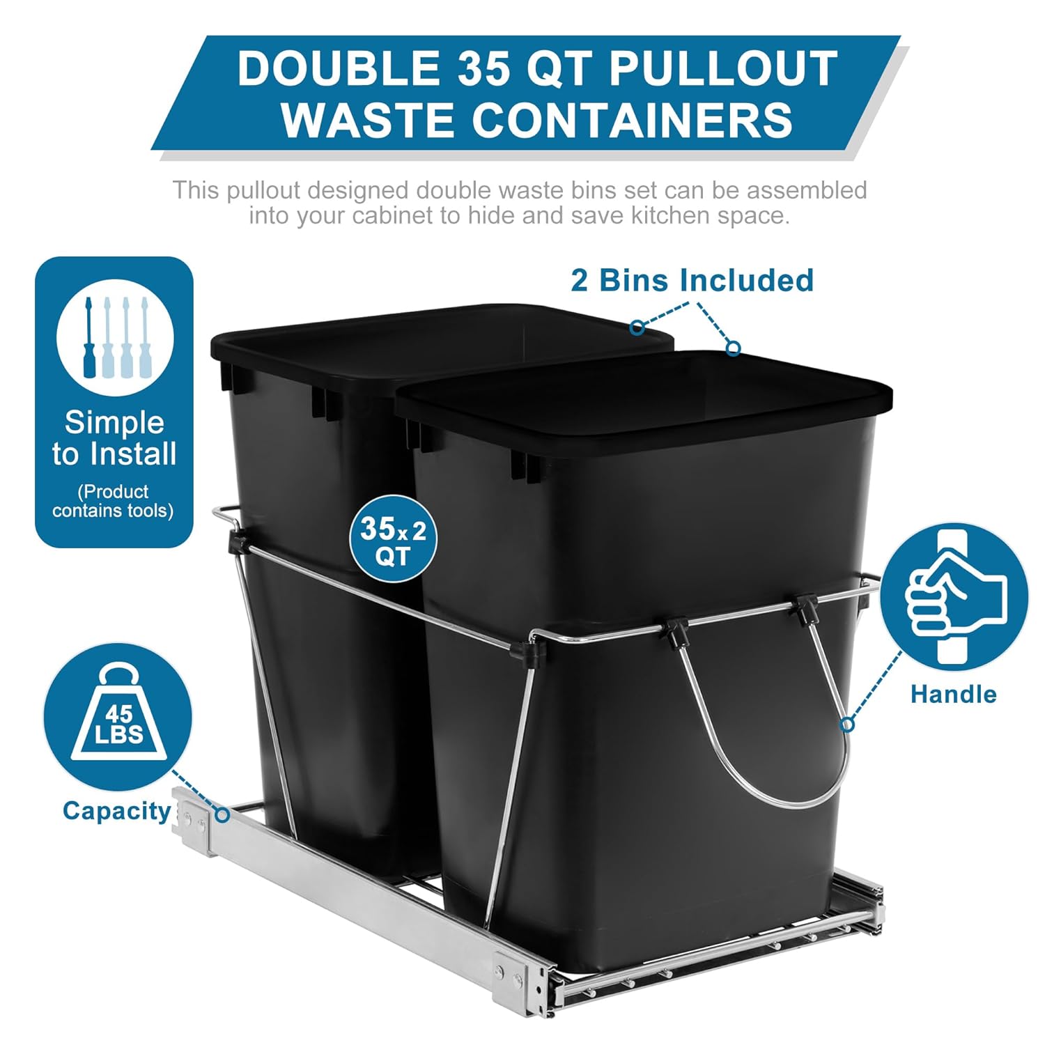 - 【2 Bins Included】A pull-out trash-can and recycling bin combination! It slides in and out of the cabinet like a dream, both bins can be taken out just as smoothly and the kitchen just looks so much neater. Package includes: (2) x 35-quart waste containers, (1) x metal frame, (1) x pair of slides, (1) x manual and mounting hardware