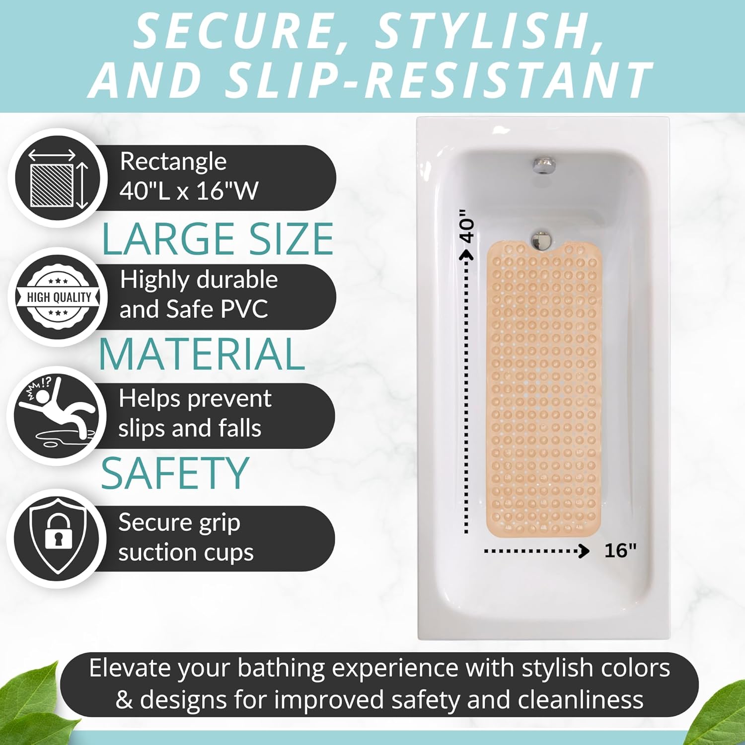 ENKOSI Bath Mat - Large Non Slip Bathtub & Shower Mat - Extra Long. 40 x 16 Inch Bathroom Mats for Tub Nonslip Anti Slip Bathmats (40x16 Beige 1-Pack)