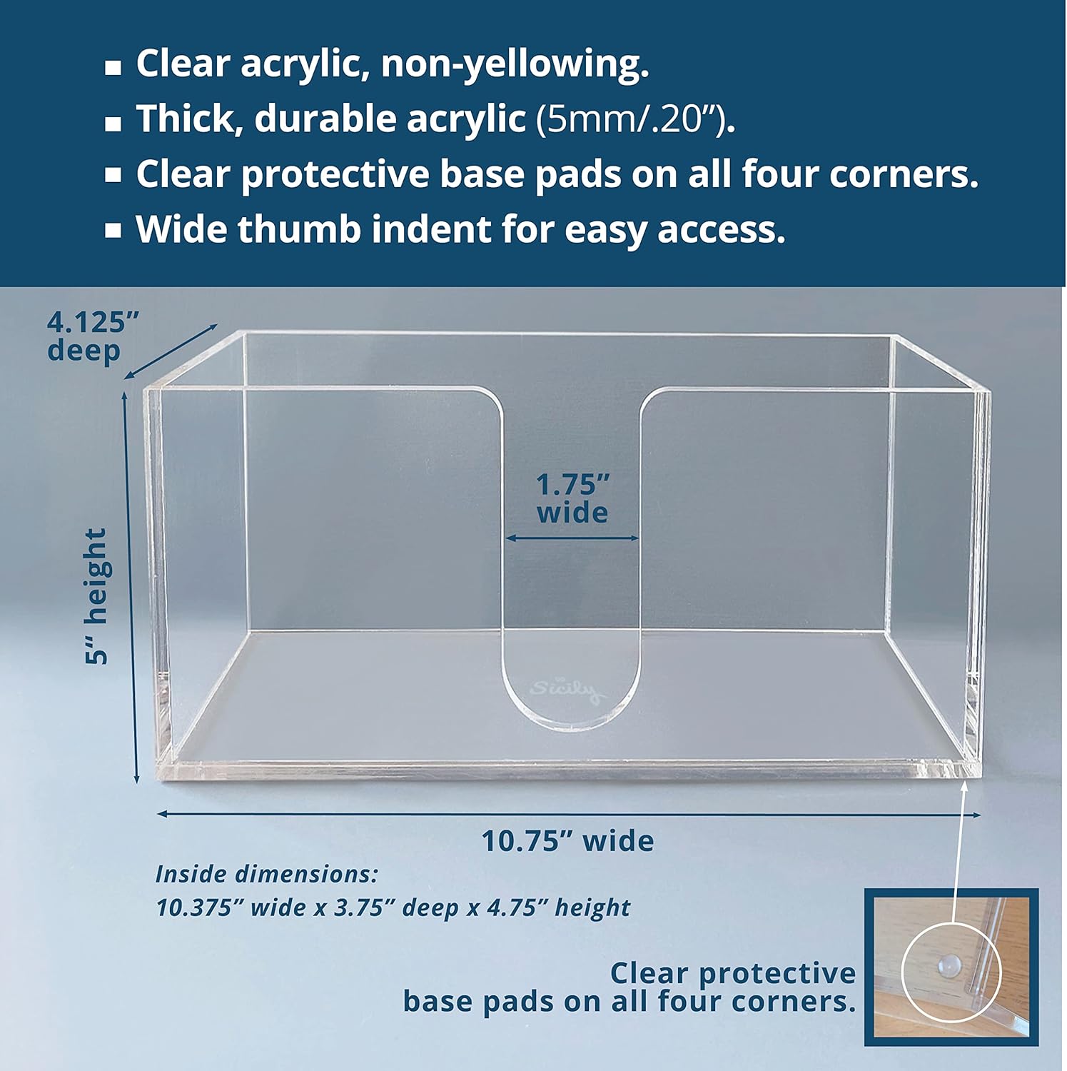 - DURABLE AND STYLISH 5mm Acrylic is impact-resistant and complements any room decor. Crystal-clear acrylic paper towel holder showcases Multi-fold and Decorative paper hand towels. The Sicily paper towel dispenser countertop RESISTS YELLOWING over time and has PROTECTIVE PADS on the base to PROTECT your countertops. Our Guest Towel Holder will be sure to encourage hand washing among family and guests.