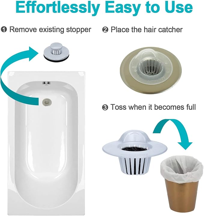 - DISPOSABLE: The most sanitary and convenient way to protect your drain. No more cleaning hair or even molds built up on the drain covers. With our product, you simply toss when it becomes full.