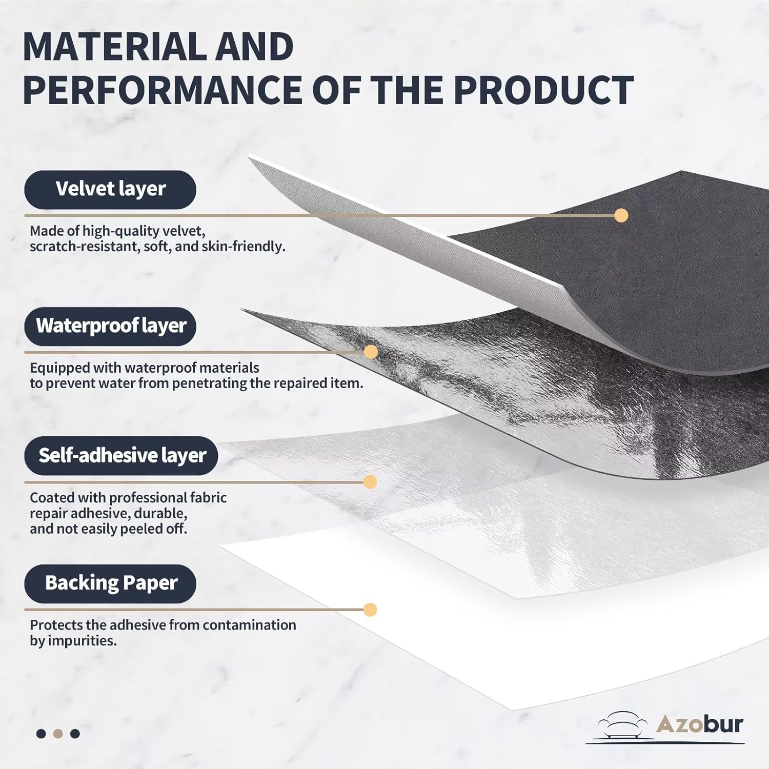 - Material and Performance: The upholstery repair tape features high-quality velvet on the front, which is scratch-resistant, soft, and skin-friendly. It has a waterproof layer in the middle to prevent water from penetrating into the repaired items. The back is coated with professional fabric repair adhesive, typically durable for at least two years. The adhesive comes with a backing paper to protect it from debris. This upholstery tape is odorless and 100% environmentally friendly.