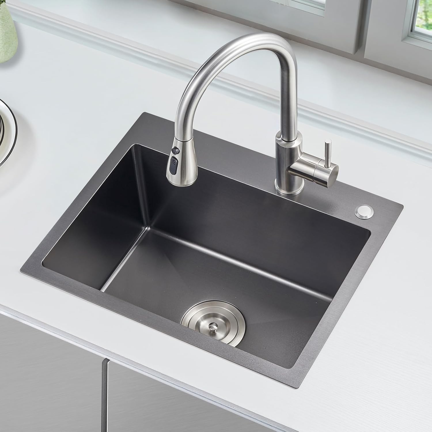 22x18 Inch Drop in Kitchen Sink, Handmade 304 Black Stainless Steel Sink, 9" Deep Single Bowl, Topmount with 2 Holes, R10 Tight Corner, for Modern Kitchen/RV/Bar Sink