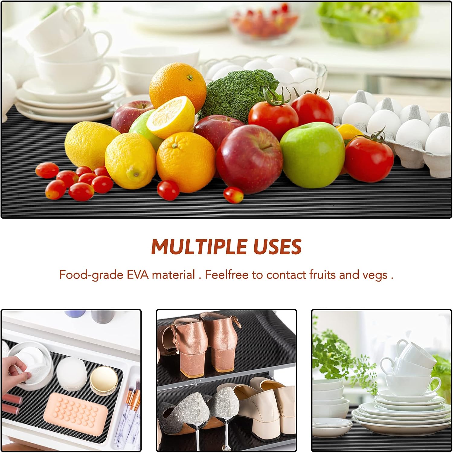 - ♥ MULTIPLE USAGES- This black shelf liner can be cut into different shapes and sizes, to fit in shelves, drawers, cabinets, kitchen furniture, dresser,wardrobe, refrigerator, office desk and counter tops or any other furniture where you want to create an extra durable solid surface.</p>