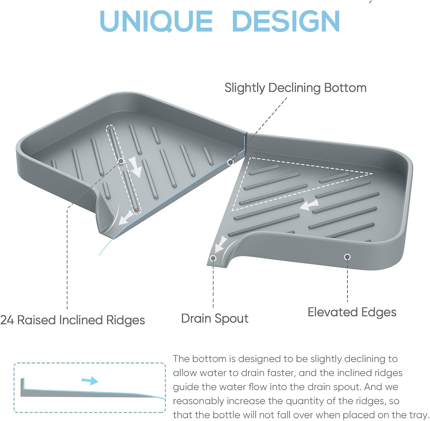 - 【Thoughtful and Unique Design】 Unique self-draining design, the bottom of the soap tray for kitchen sink is designed to be slightly declining to allow water to drain faster, the inclined ridges guide the water flow into the drain spout. And we reasonably increase the quantity of the ridges, so that the bottle will not fall over when placed on this kitchen sink storage tray organizer. All these unique features are specially designed after many tests.