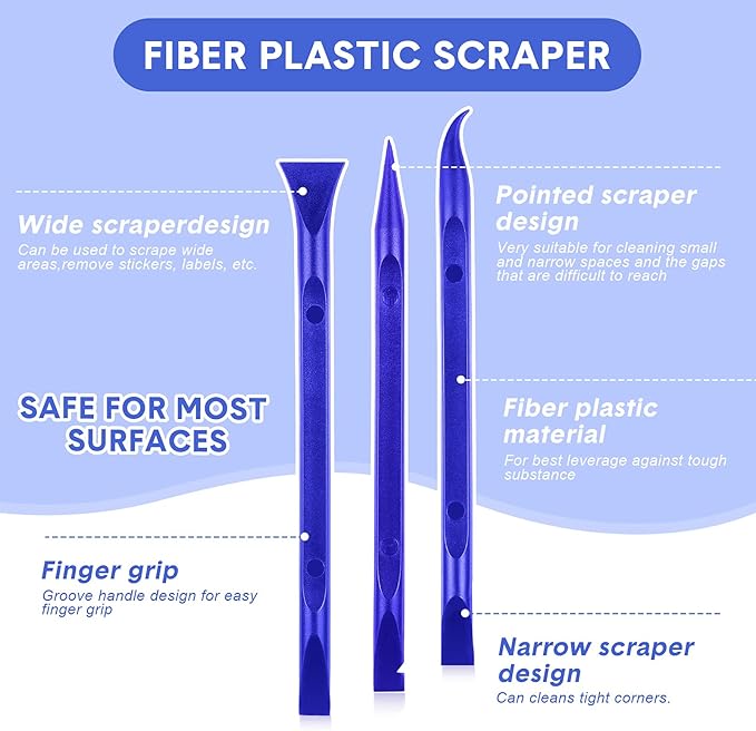 - Wide applications: this plastic scraper tool is ideal for cleaning crevices, while protecting your nails; They are also suitable for removing label stickers, grease, paint, candle wax, dirt, soap, dried foods, ticket and more on kitchen, car, bathroom, office, motorcycle, boat, workshop, garage; It can also be applied as a pry open electronic repair tool for LCD, tablet