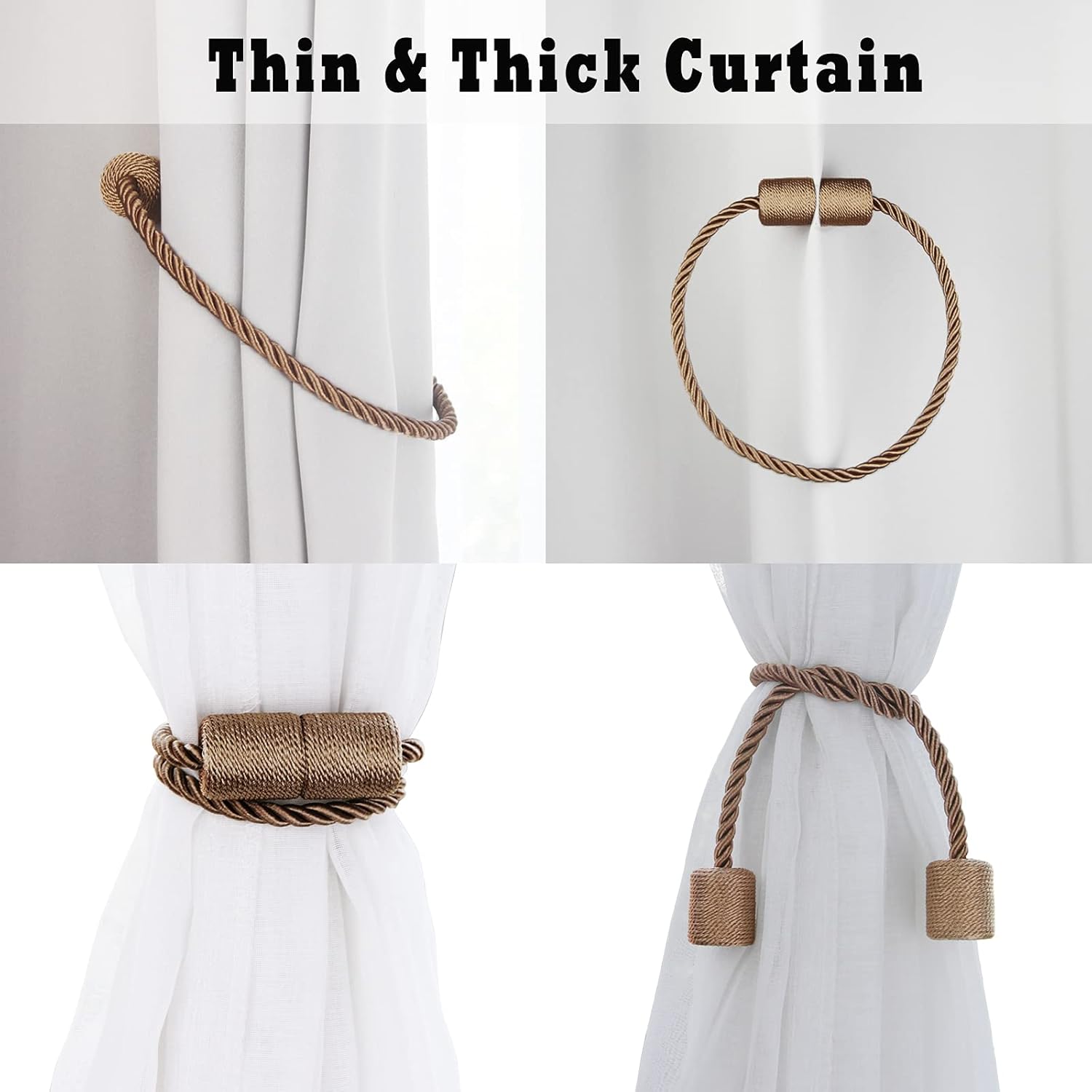 - 2 pack beautiful rope magnetic curtain tiebacks, Weight of 1 Pack- 0.12lb, Total Length - 17.5", Rope Diameter- 0.4". Could be twisted to adjust the length to meet your need, so no need to worry about the size is too big, suit for thin curtains, sheer curtains, thick shower curtains. You can refer to the various bundling methods shown on our pictures.
