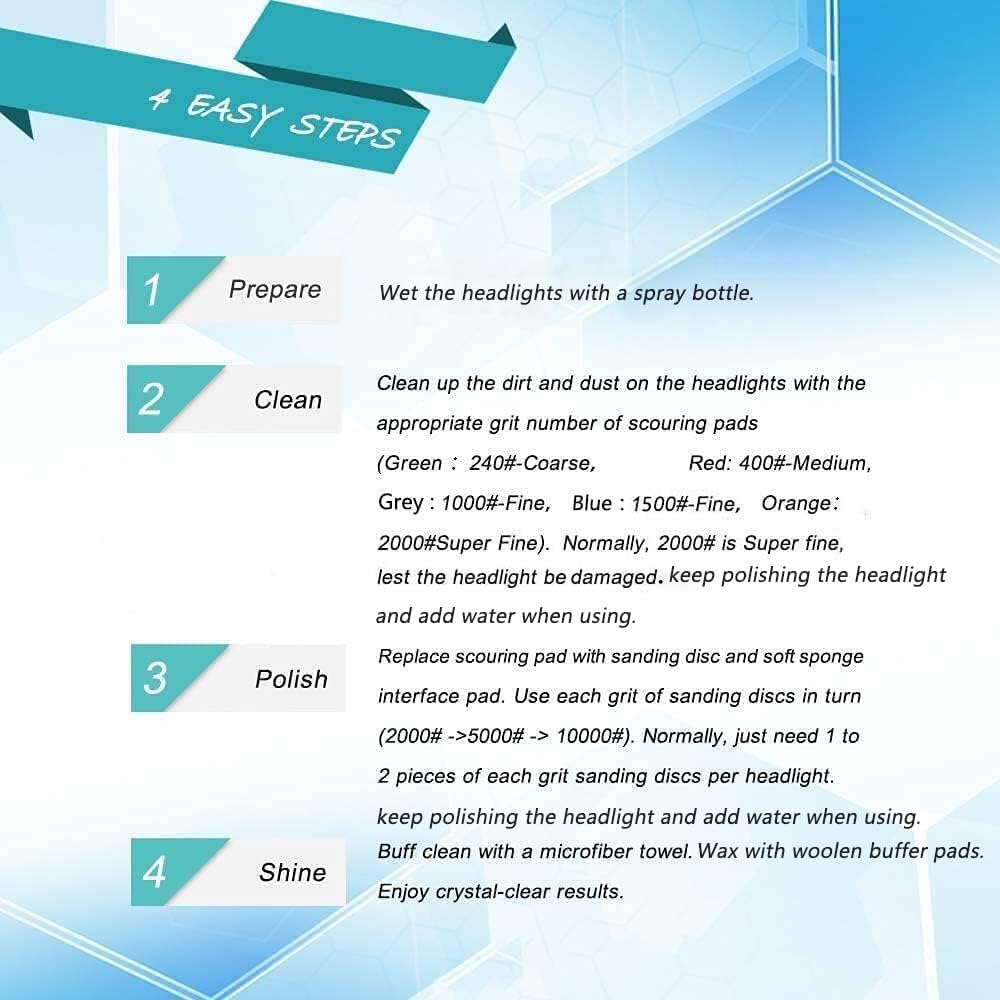 - 【EASY 4-STEP】Step 1 - Prepare a spray bottle of water and drill. Step 2 - Clean with scouring pads(P240 → P400 → P1000→ P1500→ P2000). Step 3 - Polish with interface pad and sanding discs (P2000 → P5000 → P10000). Step 4 - Wax with woolen buffer pads. Physical restoration with headlight restoration pads, without any chemical fluid, safe and environmental-friendly.