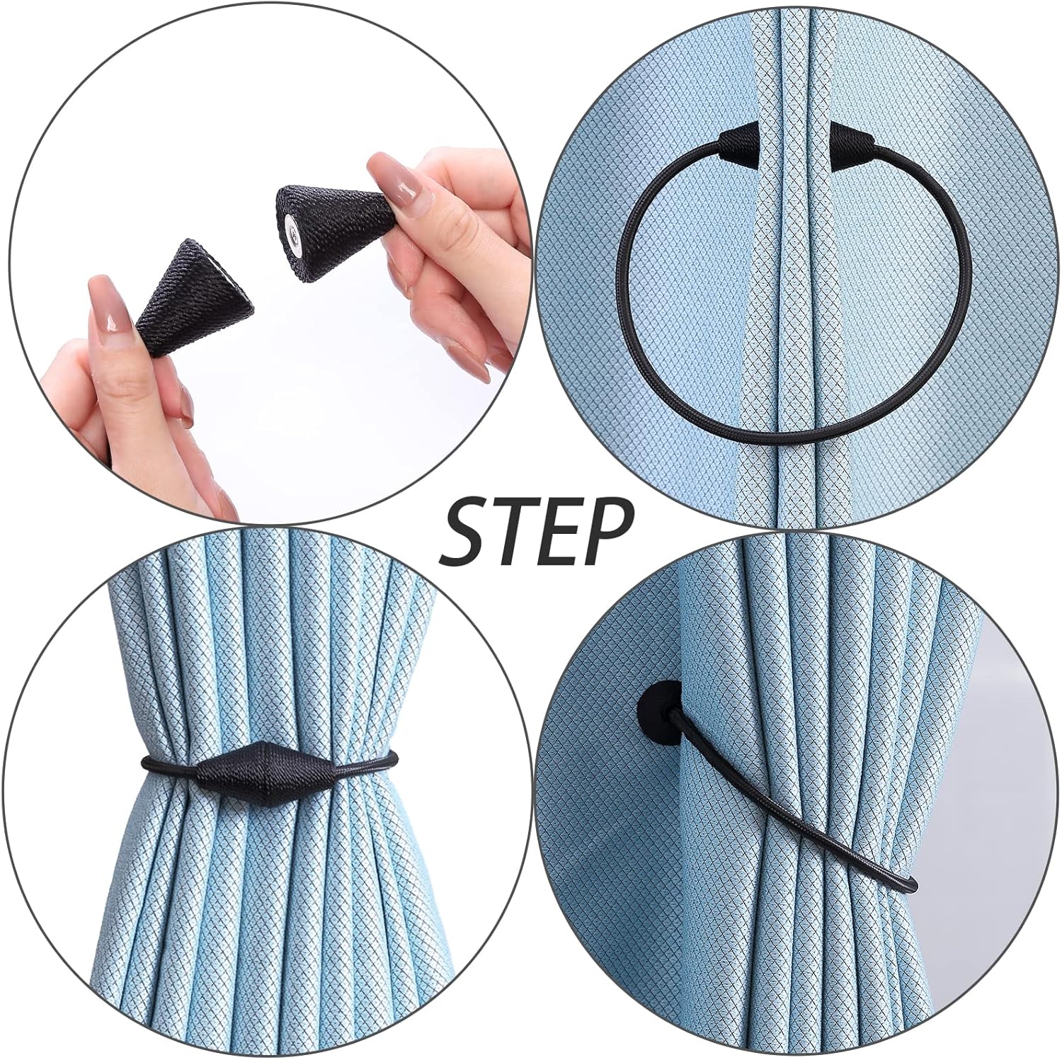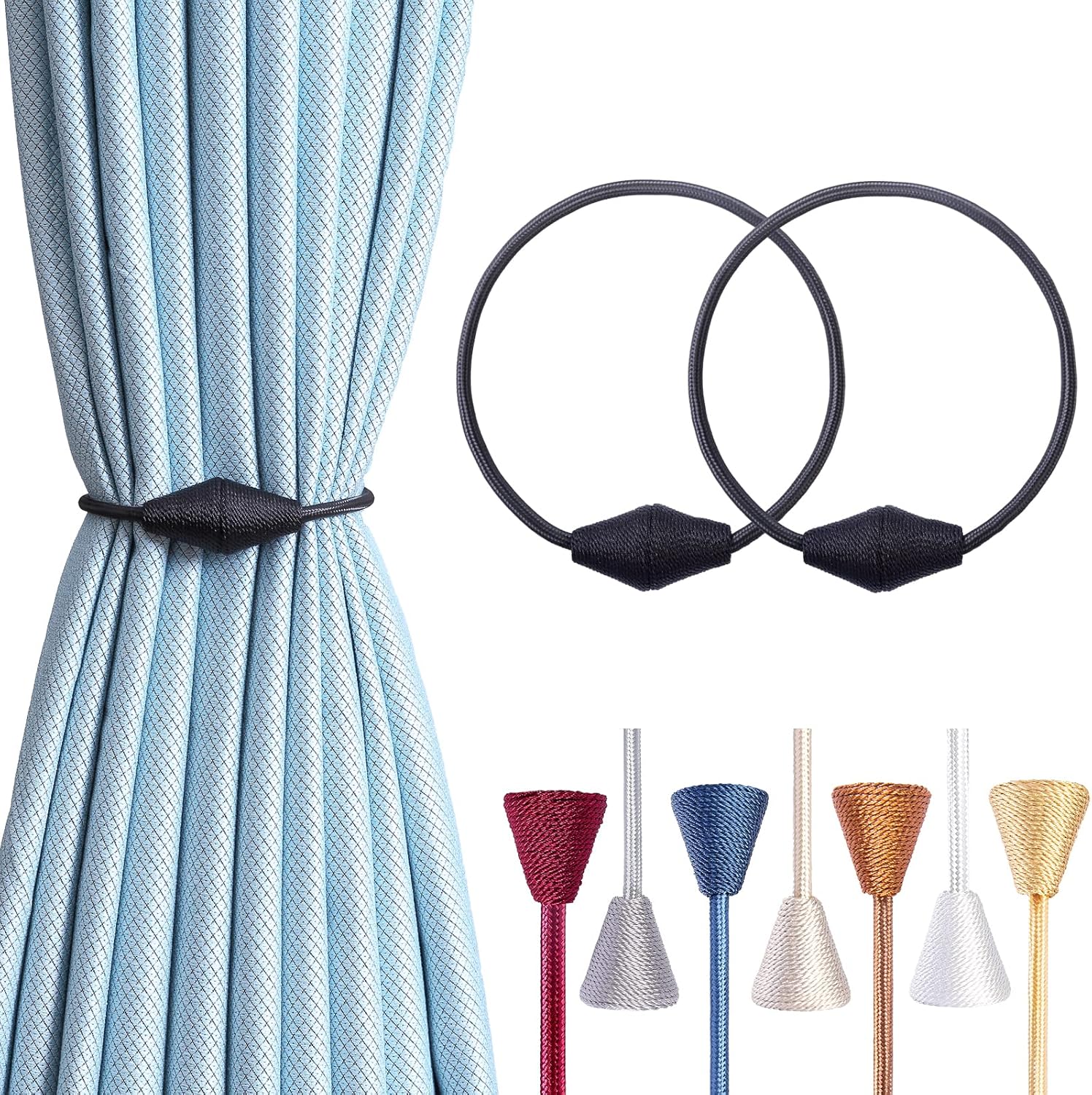 - WIDE APPLICATION: The length and binding method can be adjusted freely according to the thickness of the curtain. It is widely used in curtains in different places such as bedroom, living room, dining room, bathroom, kitchen, office, courtyard and so on. Different colors of magnetic drape tiebacks adorn your curtains, which can change different styles, giving the curtains a unique charm
