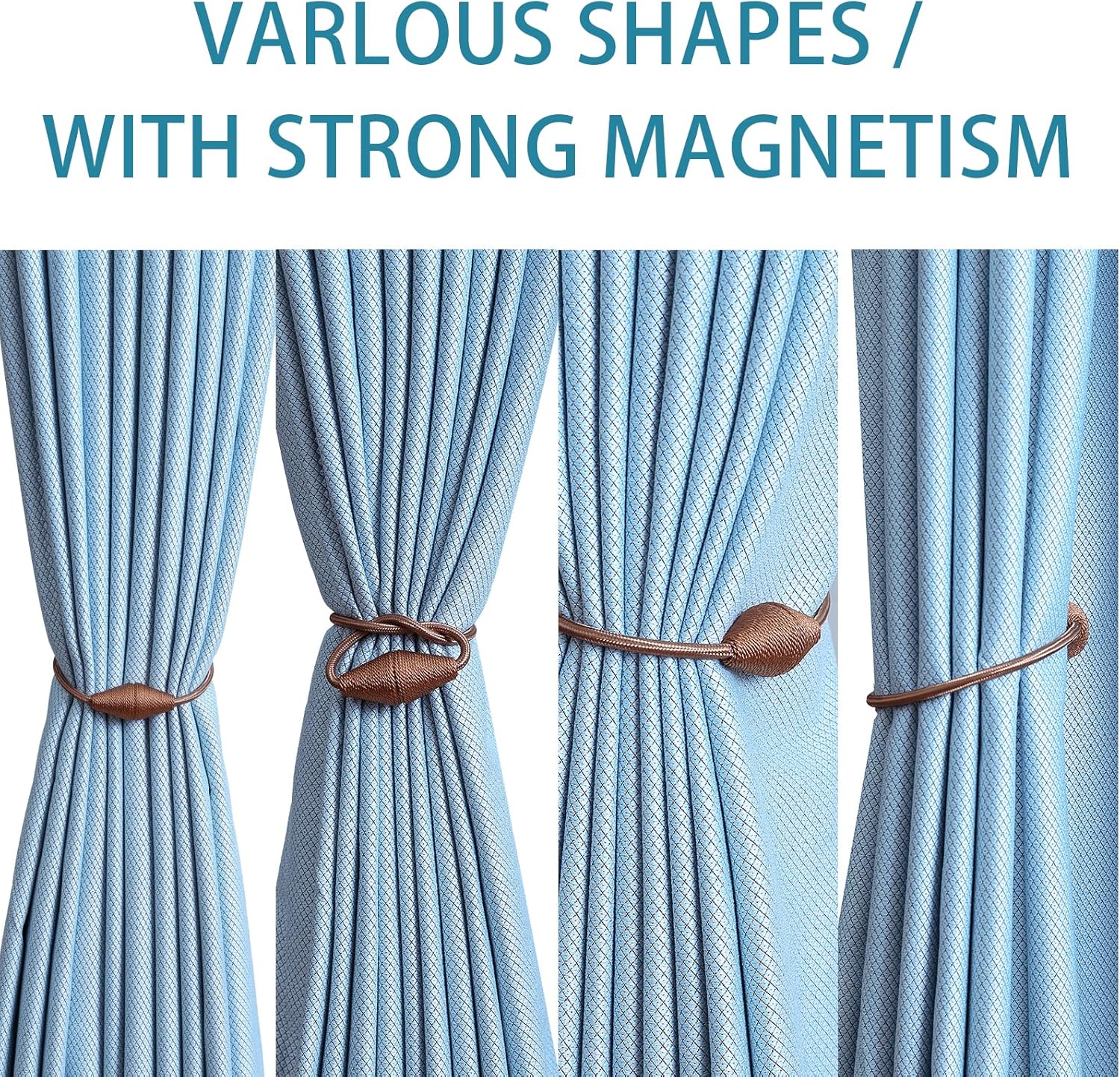 - WIDE APPLICATION: The length and binding method can be adjusted freely according to the thickness of the curtain. It is widely used in curtains in different places such as bedroom, living room, dining room, bathroom, kitchen, office, courtyard and so on. Different colors of magnetic drape tiebacks adorn your curtains, which can change different styles, giving the curtains a unique charm