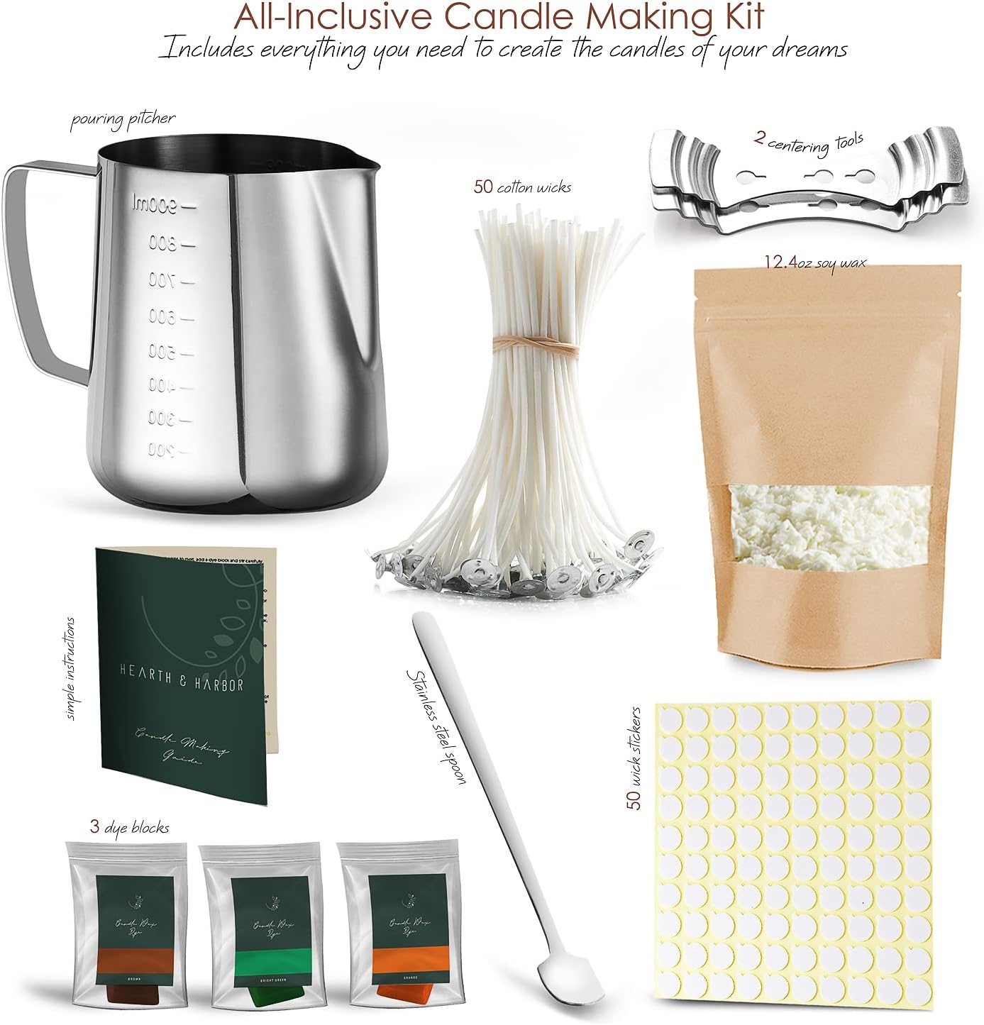 - SOY CANDLE MAKING KIT FOR ADULTS: Make your own candles with our candle making supplies kit: natural soy wax for candle making 12.4 oz bag, 3 dye blocks, 50 cotton candle wicks for candle making, 50 candle wick stickers, 2 wick holders, 900 ml melting pot, and stirring spoon.