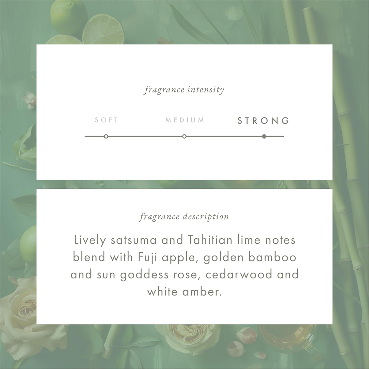 - LOSE YOURSELF IN THE WARM TONES OF SUN-SOAKED BAMBOO AND PERSIAN LIME. Within this medley of citrus, sweet fruits, and florals, lively satsuma mandarin and Tahitian lime mingle with Fuji apples and golden rose. Notes of cedarwood and white amber bring an earthy musk, balancing the bright citrus for an intoxicating fragrance journey.