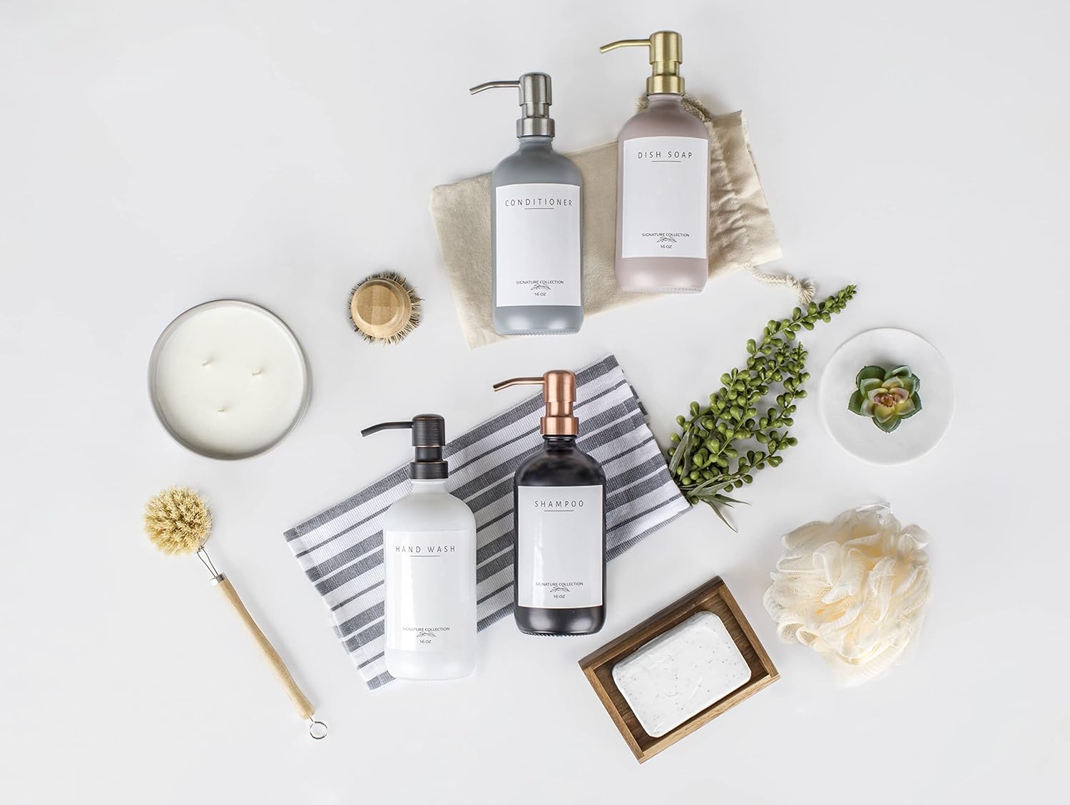 - ✅ 5 WATERPROOF LABELS: Now with 5 stickers, it's your choice to use the Kitchen Soap Dispenser Set with Dish Soap for hand soap, dish wash, lotion, conditioner, or shampoo. To clean the lotion dispenser set for the bathroom and kitchen sink soap dispenser set, just run the bottle under water and watch any residue simply wash off. With our exclusive no-leak pump, the bottle enables you to put out a good amount of soap with a single pump.