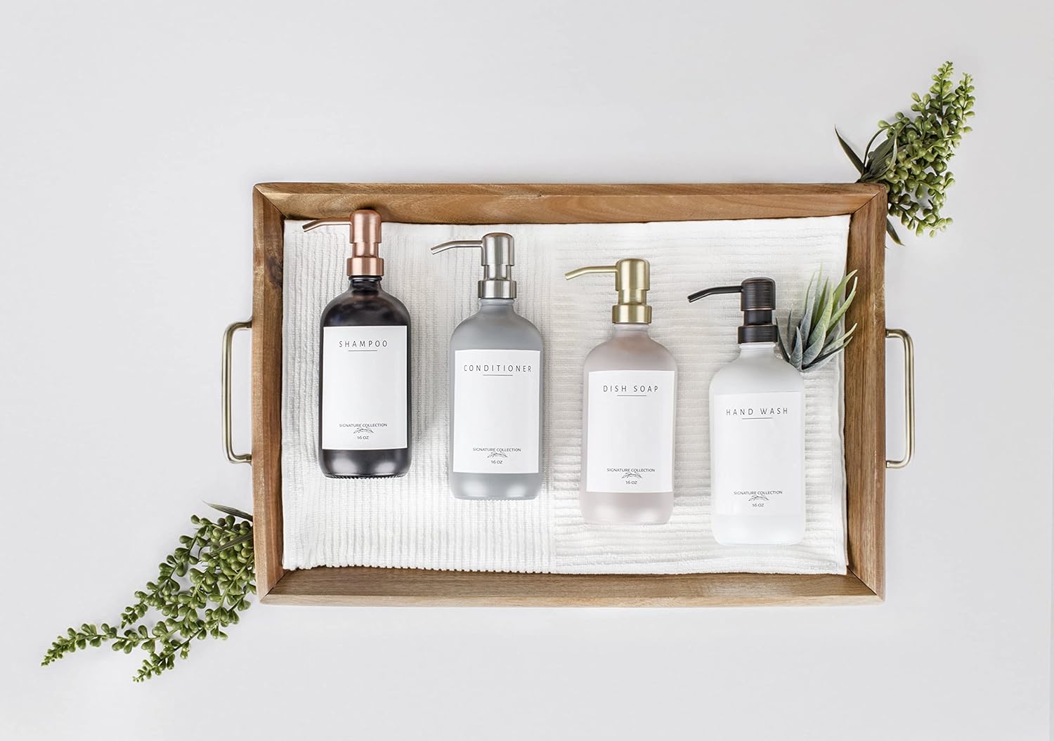 - ✅ 2-in-1 COMBO: Upgrade your home with our glass soap dispenser set. The dish soap dispensers are crafted from the highest quality glass and can be used as soap dispensers for kitchen sinks, soap dispensers for bathrooms, or as hand soap dispenser of your favorite liquid. The kitchen soap dispensers come with 2 dish soap dispensers for kitchen bottles (16 ounces), 2 stainless steel pumps, and 5 waterproof labels. Our selection includes colors including amber, clear, white, and black.
