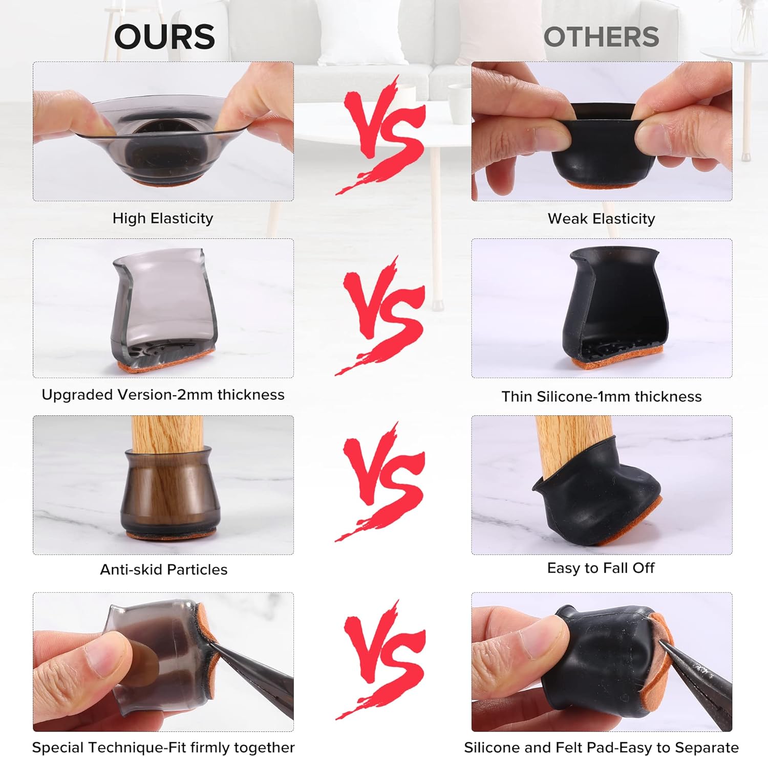 - ✅【Comprehensive Improvement】The rubber protectors are made of a combination of silicone covers and felt pads.Gels and nails are not used. After investigation, it is found that the chair leg cushions made of silicone and gel are easy to separate the felt after use, and the silicone will break. So after improvement, we injected the silicone and felt into one body, and the inner wall was thickened to 2mm, which greatly enhanced the pull resistance and abrasion resistance of the chair leg cushions.