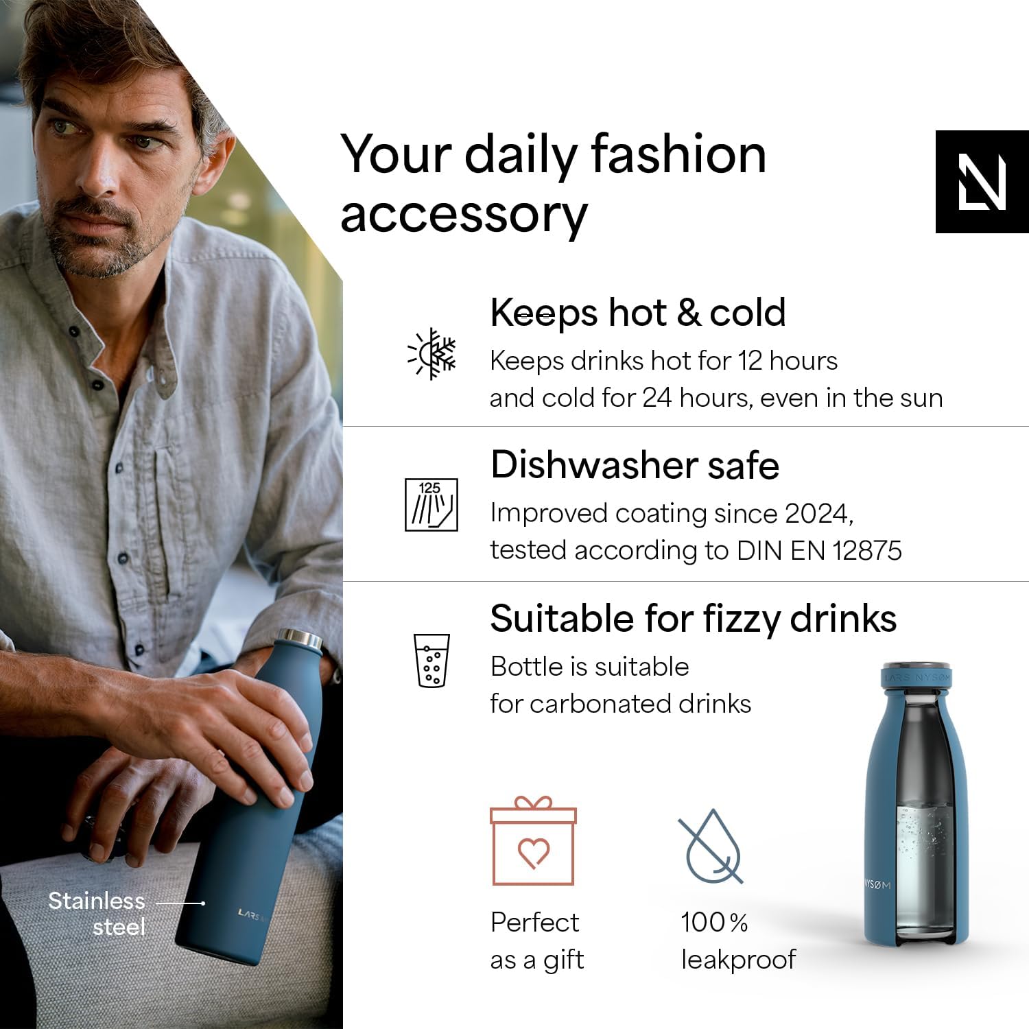 - IDEAL GIFT: The water bottle is perfect as a gift for Christmas. The sports bottle is made of high-quality 18/8 Stainless-Steel and is ideal for carbonated drinks, water and juices.