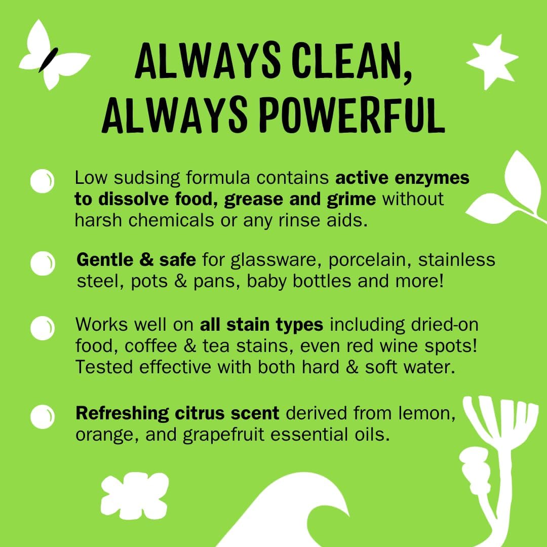 - POWERFUL YET GENTLE: Low sudsing formula contains active enzymes to dissolve food, grease & grime without the need for harsh chemicals or any rinse aids. Works well on all stain types including dried-on food, coffee & tea stains, even red wine spots! Effective with both hard and soft water.