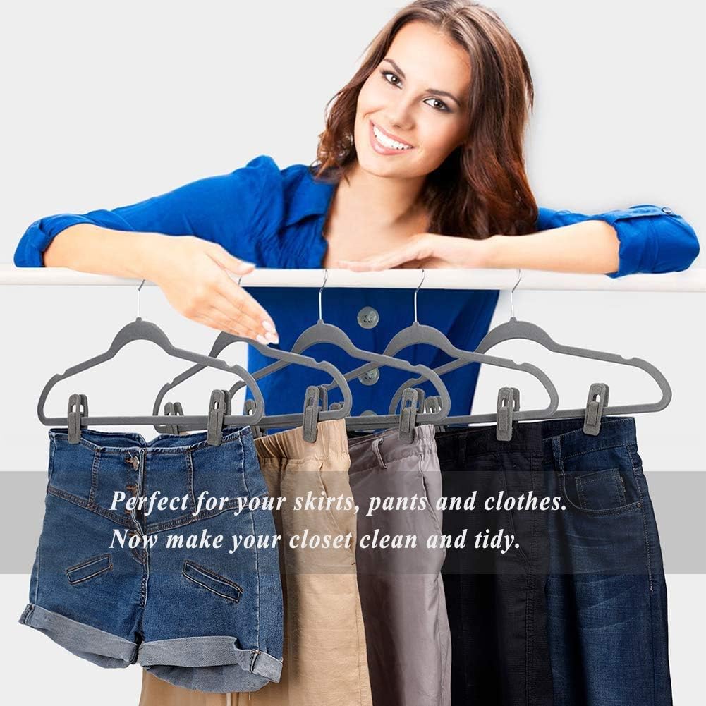 - ✅ PREFECT FOR YOUR CLOSET - The grey velvet clips are fixed to the velvet hangers to provide you with more closet space and keep your clothes tidy