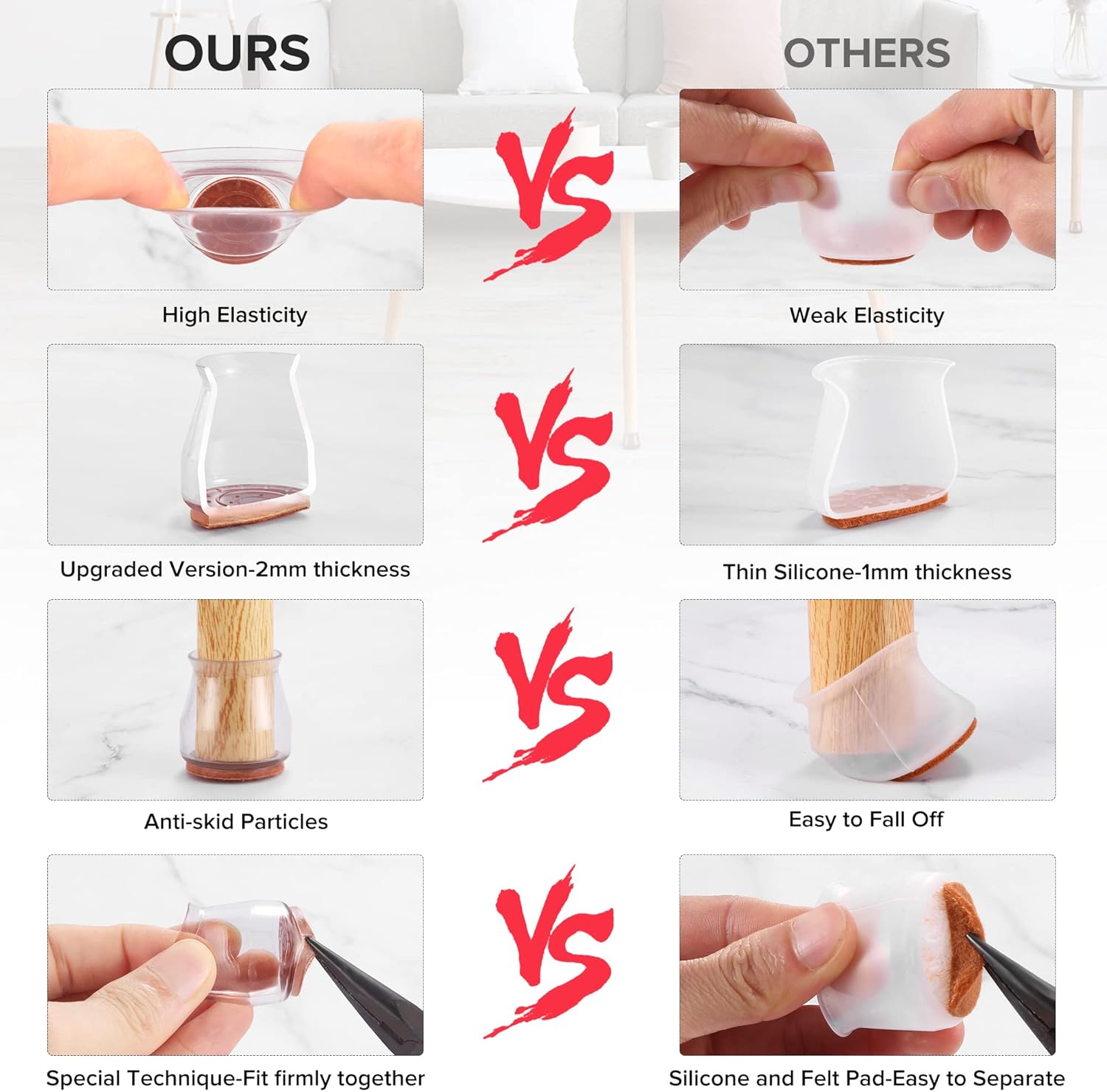 - ✅【Comprehensive Improvement】The rubber protectors are made of a combination of silicone covers and felt pads.Gels and nails are not used. After investigation, it is found that the chair leg cushions made of silicone and gel are easy to separate the felt after use, and the silicone will break. So after improvement, we injected the silicone and felt into one body, and the inner wall was thickened to 2mm, which greatly enhanced the pull resistance and abrasion resistance of the chair leg cushions.