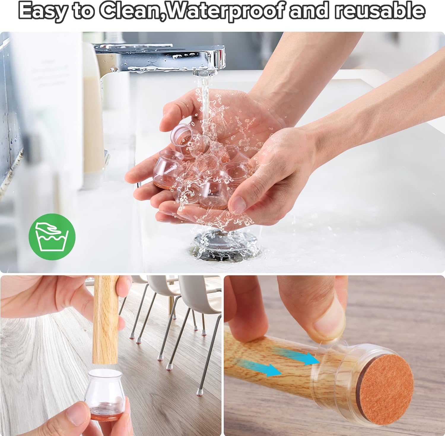 - ✅【Easy to Use】The chair leg covers to protect floors has high transparency, which greatly restore the original color of the table and chair legs, look more natural. The furniture leg cap is easy to install, without the use of tools. When the furniture chair socks are dirty, the chair stoppers can be cleaned and used repeatedly. Mainly suitable for smooth floors such as hardwood, tile, composite floor, and vinyl floor. Clear cap style match with most floors.