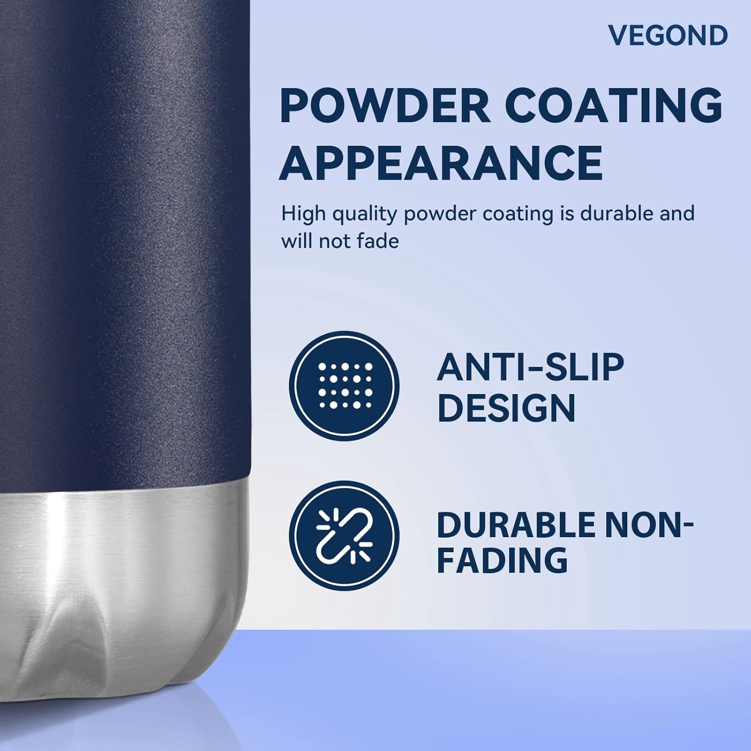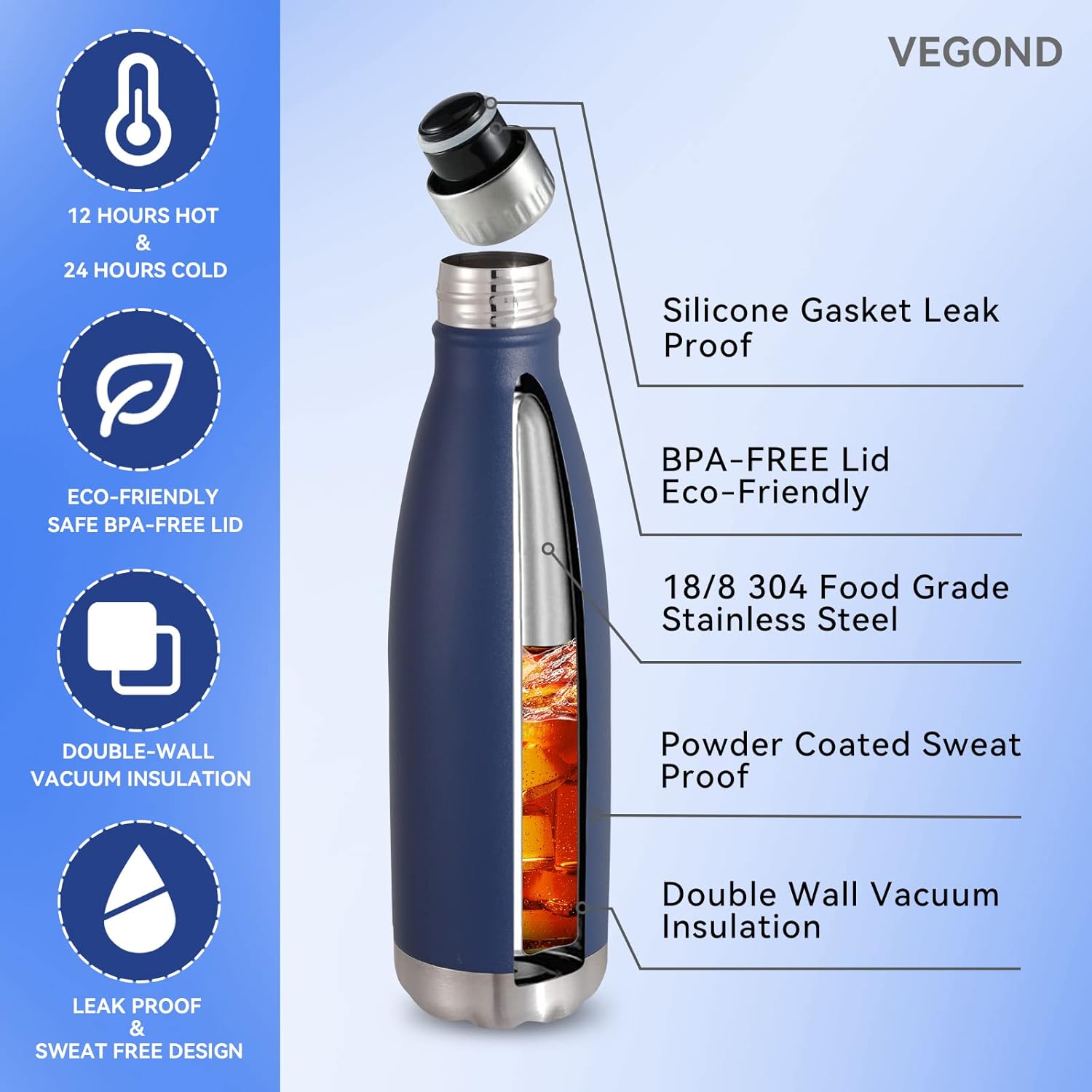 - All Day Heat / Cold Preservation : VEGOND double wall vacuum sports water bottles feature advanced heat preservation technology, keep your favorite drinks cold for up to 24 hours and hot for up to 12 hours. You can bring hot water, ice water, coffee, drinks with you. A 1.25”-diameter mouth accommodates small ice cubes and chopped fruits. The metal water bottle feature humanized design allows you to enjoy coolness in the hot summer and warmth in the cold winter