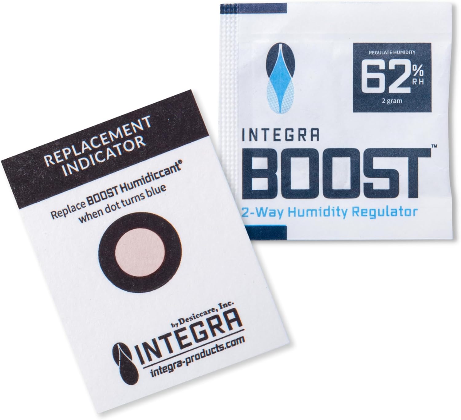 - 2-GRAM BOOST EFFICIENCY: Each 2 gram Integra Boost pack manages moisture for up to 7 grams of product, ideal for smaller storage. The pack includes 6 individually wrapped Boost Packs with Humidity Indicator Cards, packaged in a resealable blue bag.