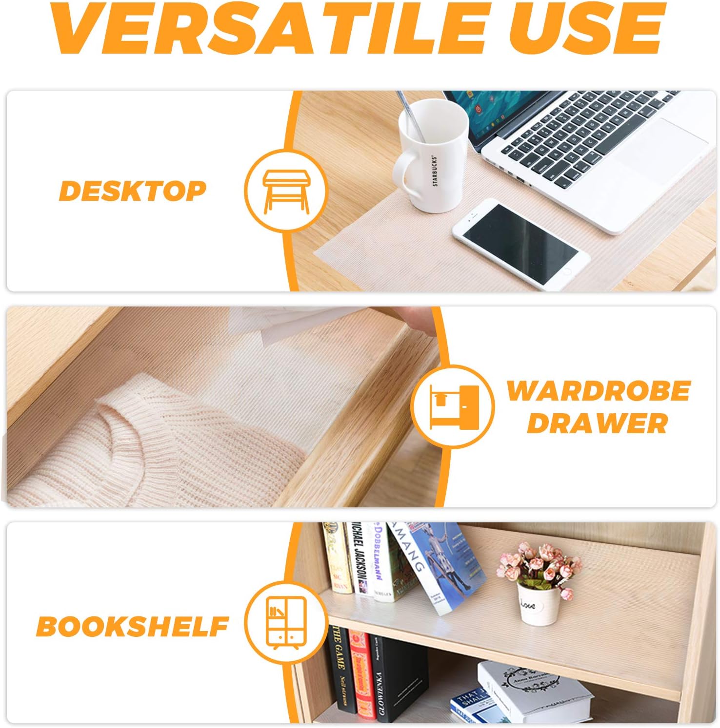 - π PERFECT STORAGE SOLUTION- These shelf liner come in 12" x 20 ft. Made of EVA material and feature a non-slip design, the shelf liners for kitchen cabinets help prevent spillage by keeping your items locked into place and free from unwanted dirt and debris. The plastic drawer liners for dresser is ideal for use in a top drawer, bedroom dresser, bathroom cabinets, kitchen cabinets and desk drawers for organizing and protecting small items from damage or scratches.