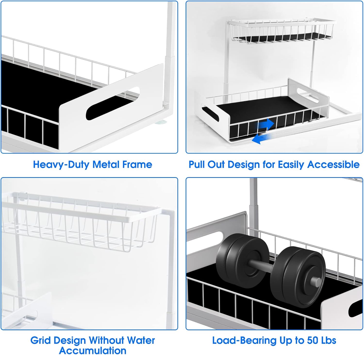 - High-Quality: Our under sink organizer is made of carbon steel, which is durable and resistant. The baking paint process makes the surface more smooth with good anti-rust and can keep the metallic luster even in the wet bathroom or greasy kitchen, the bottom has 4 rubber feet to protect the surface from scratches. The sink rack has a carrying capacity of up to 55lbs and can hold heavier items. It will not deform even if it placing heavy objects for a long time, Pulling is also very smooth.