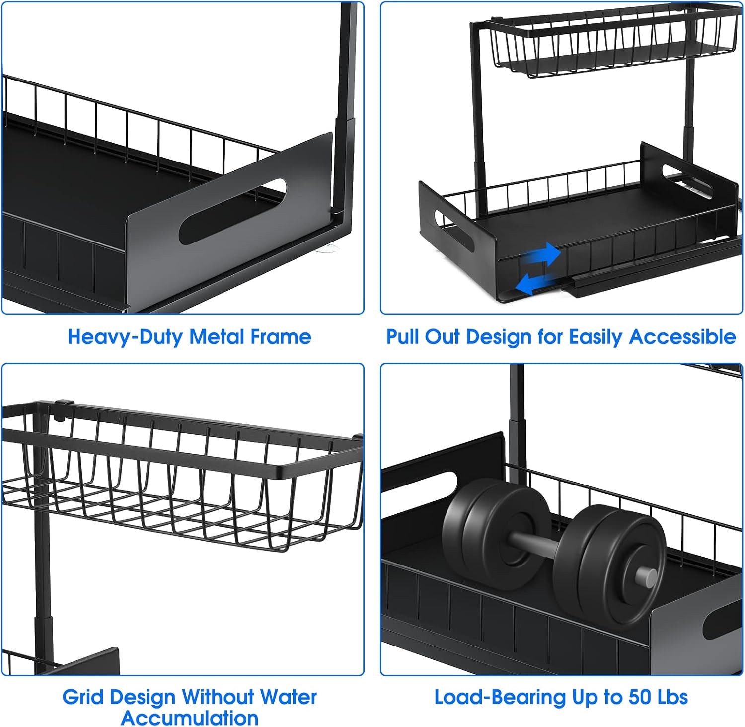 - High-Quality: Our under sink organizer is made of carbon steel, which is durable and resistant. The baking paint process makes the surface more smooth with good anti-rust and can keep the metallic luster even in the wet bathroom or greasy kitchen, the bottom has 4 rubber feet to protect the surface from scratches. The sink rack has a carrying capacity of up to 55lbs and can hold heavier items. It will not deform even if it placing heavy objects for a long time, Pulling is also very smooth.