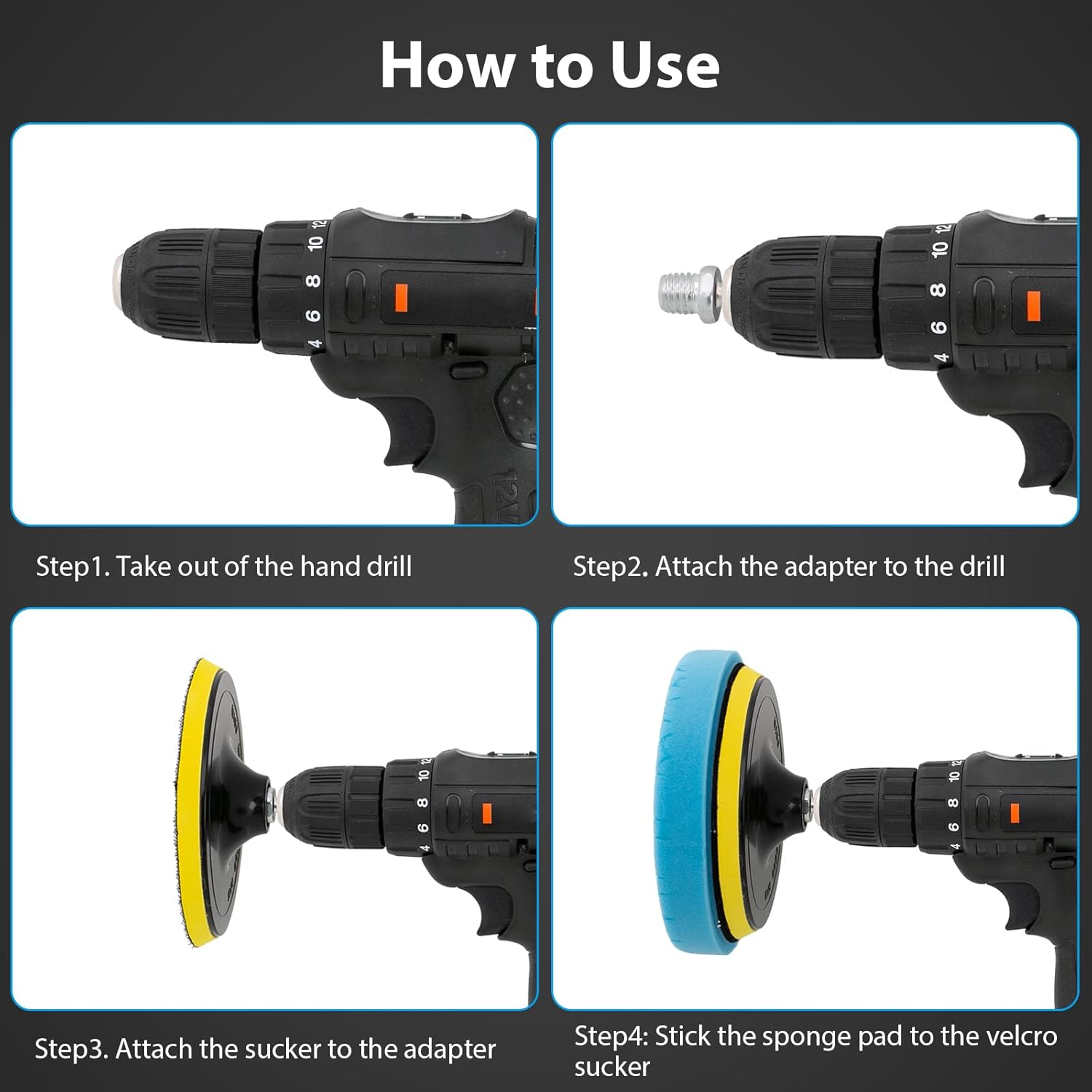 - 【Usage Steps】 Five colors represent five kinds of roughness. Hardness: orange>yellow>blue>white>black, you can choose polishing according to your needs. Orange polishing pads for rough polishing, blue and yellow for medium polishing, white for fine polishing, and black for finish polishing and waxing