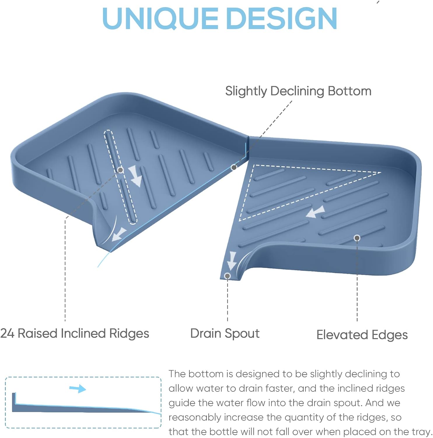 - Bottom Slope Design: Unique self-draining design, the bottom of the soap tray for kitchen sink is designed to be slightly declining to allow water to drain faster, the inclined ridges guide the water flow into the drain spout. And we reasonably increase the quantity of the ridges, so that the bottle will not fall over when placed on this kitchen sink storage tray organizer. All these unique features are specially designed after many tests.
