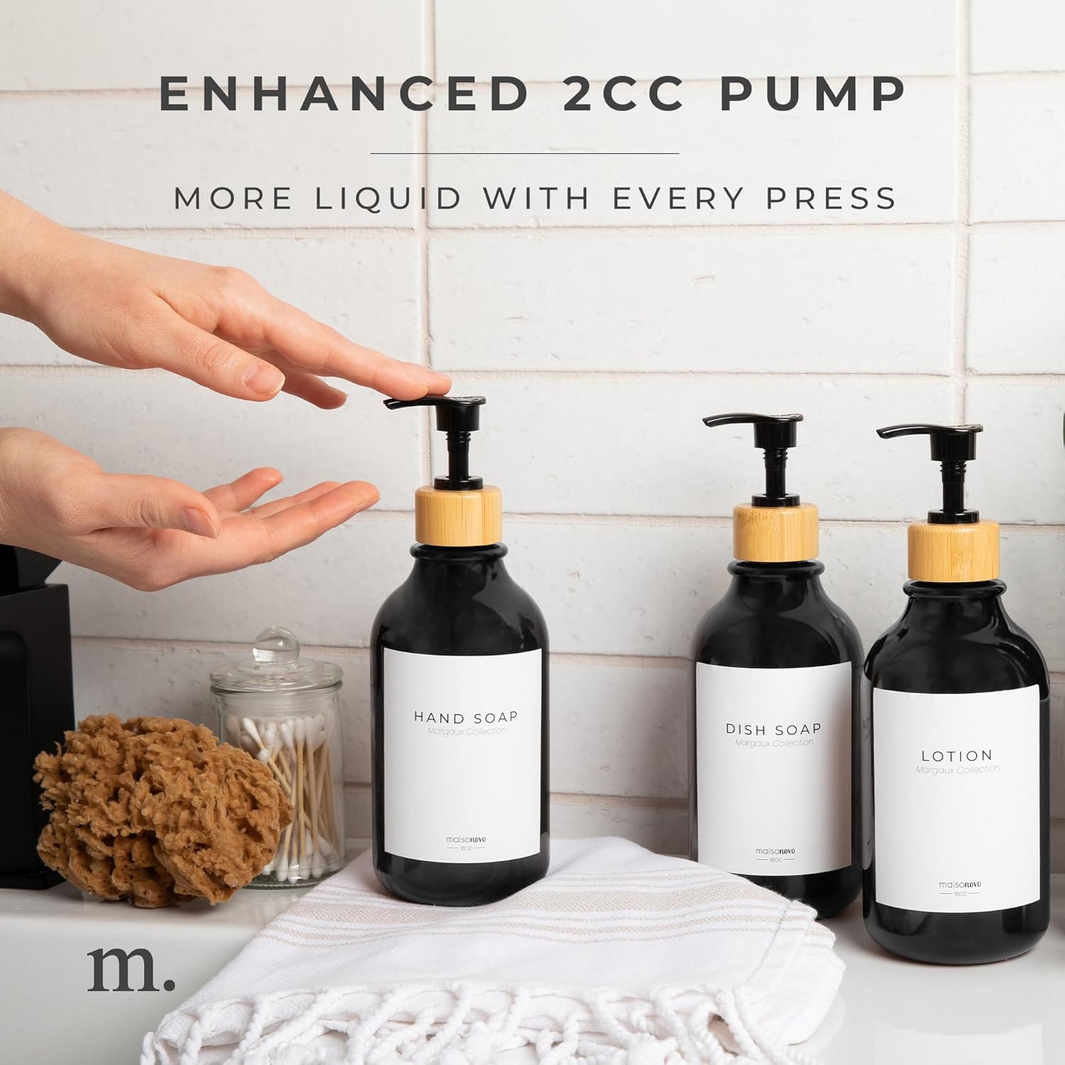 - Pack Includes: 3 extra-thick PET plastic shampoo bottles refillable with pump which can hold 16.9 fl oz/500ml; 6 waterproof marguax labels including hand soap, dish soap, lotion, shampoo, conditioner, body wash. The ideal bathroom accessories set for your home!