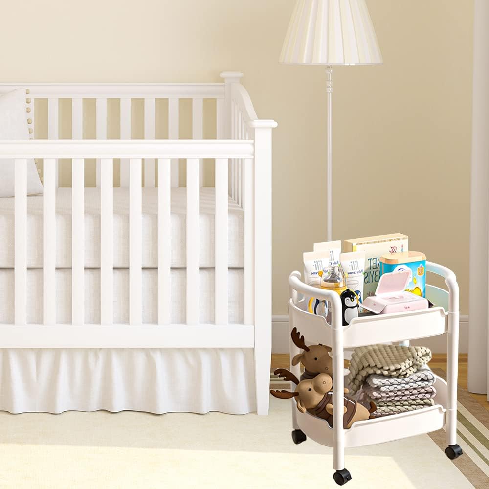 2-Tier Plastic Rolling Utility Cart with Handle Tower Rack Snack Cart with Wheels Multi-Functional Storage Trolley for Kitchen Bathroom Laundry Home Office Living Room Organization, White