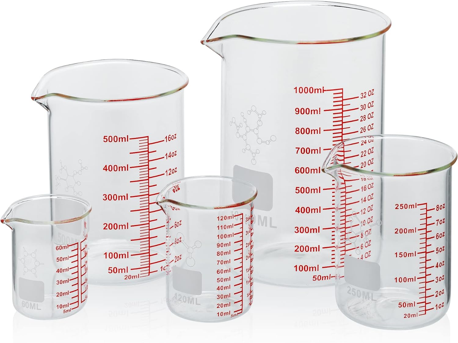 - High Borosilicate Glass Measuring Cup Set,Includes 60ml(2OZ), 120ml(4OZ), 250ml(8OZ), 500ml(16OZ), and 1000ml (32OZ),If you receive a damaged item, please contact us and we will replace it with a brand new one