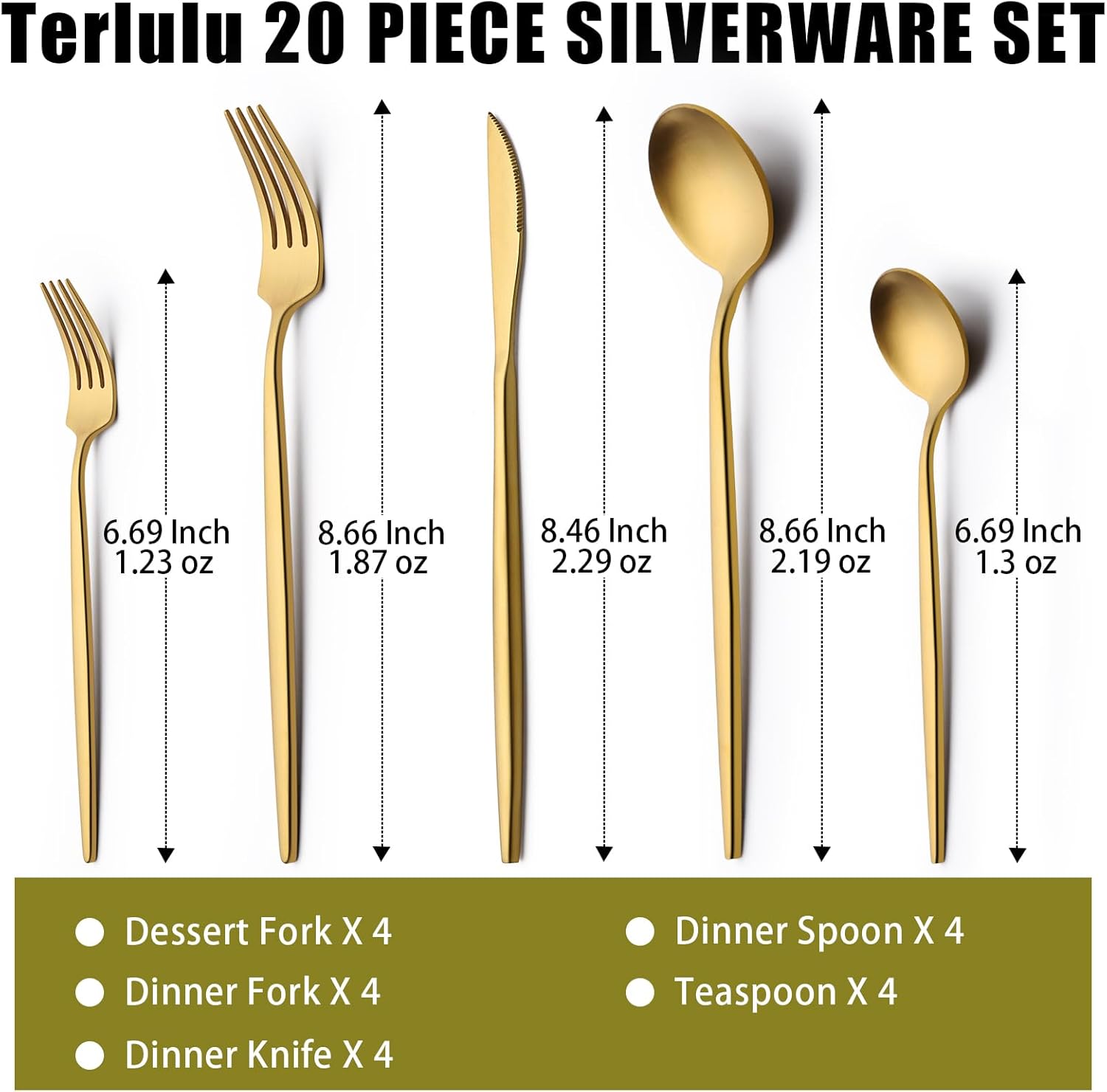 - 【SERVICE FOR 4】 Terlulu 20 piece gold silverware set for 4 includes 4 dinner forks, 4 dinner spoons, 4 dinner knives, 4 teaspoons, 4 salad/dessert forks in normal size, perfect for most families.