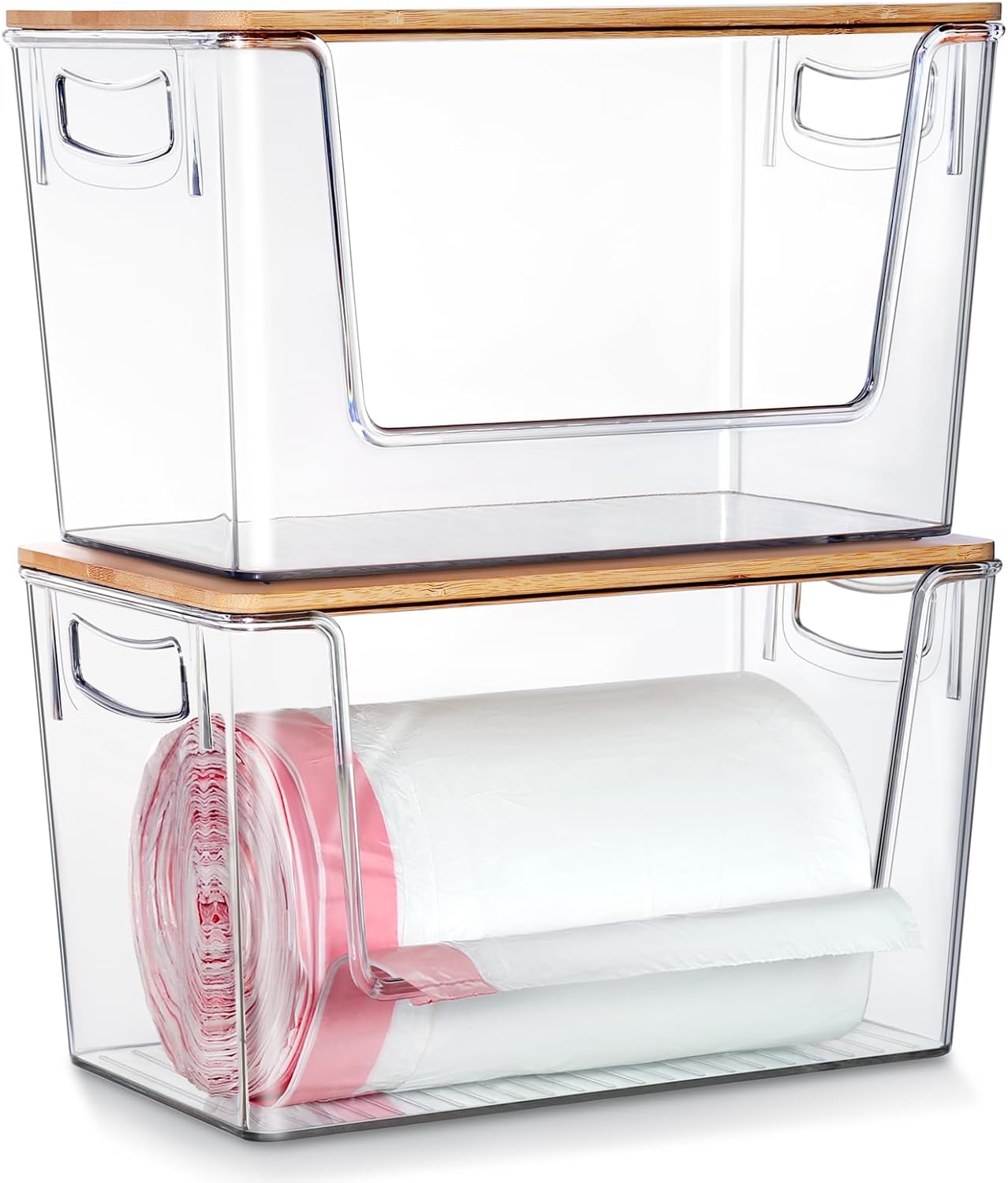 2 Pack Trash Bag Holder Dispenser, Extra Large Garbage Bags Holder, Stackable Trash Bag Holder with Bamboo Top for Laundry Room & Under Sink