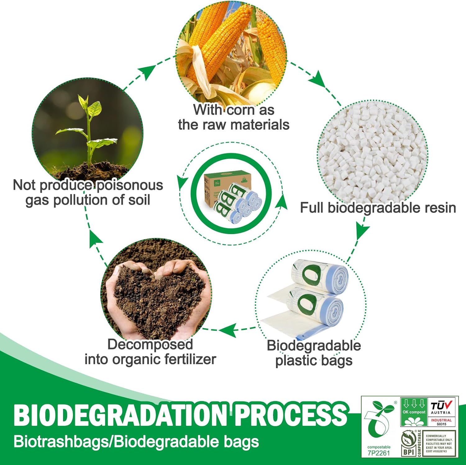 - Biodegradable Trash Bags: These small medium Large garbage bags made from entirely materials such as corn starch and plant-based, our biodegradable garbage bags will degrade to CO2, water and organic biomass after 6-12 months.