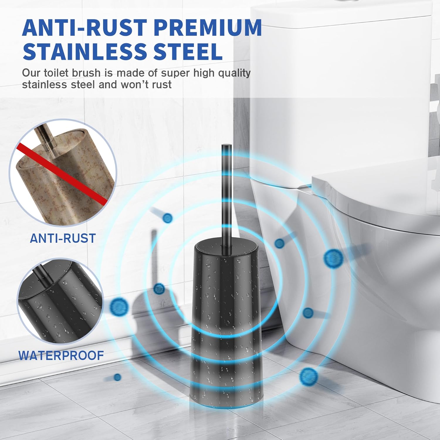 - đ˝ăRUST RESISTANCEăMade of premium 304 stainless steel, this toilet brush won't rust in decades. No worry about any cleaner or liquid left in holder. Toilet brush can keep its elegant a long-time. Other than shiny steel toilet brush, this toilet brush is designed to be matte finish so it wonât reflect dazzling light.