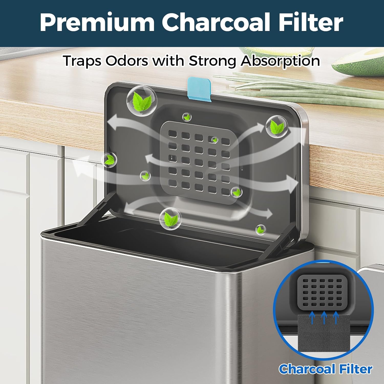 - Odor Absorbing Filter - The activated-charcoal filter included inside this trash can (NOT in other brands) traps and absorbs odors without leaking funky smells. Stainless steel trash can with lid enhances the sealing effect, specifically designed to hide smelling and fruit fly free.