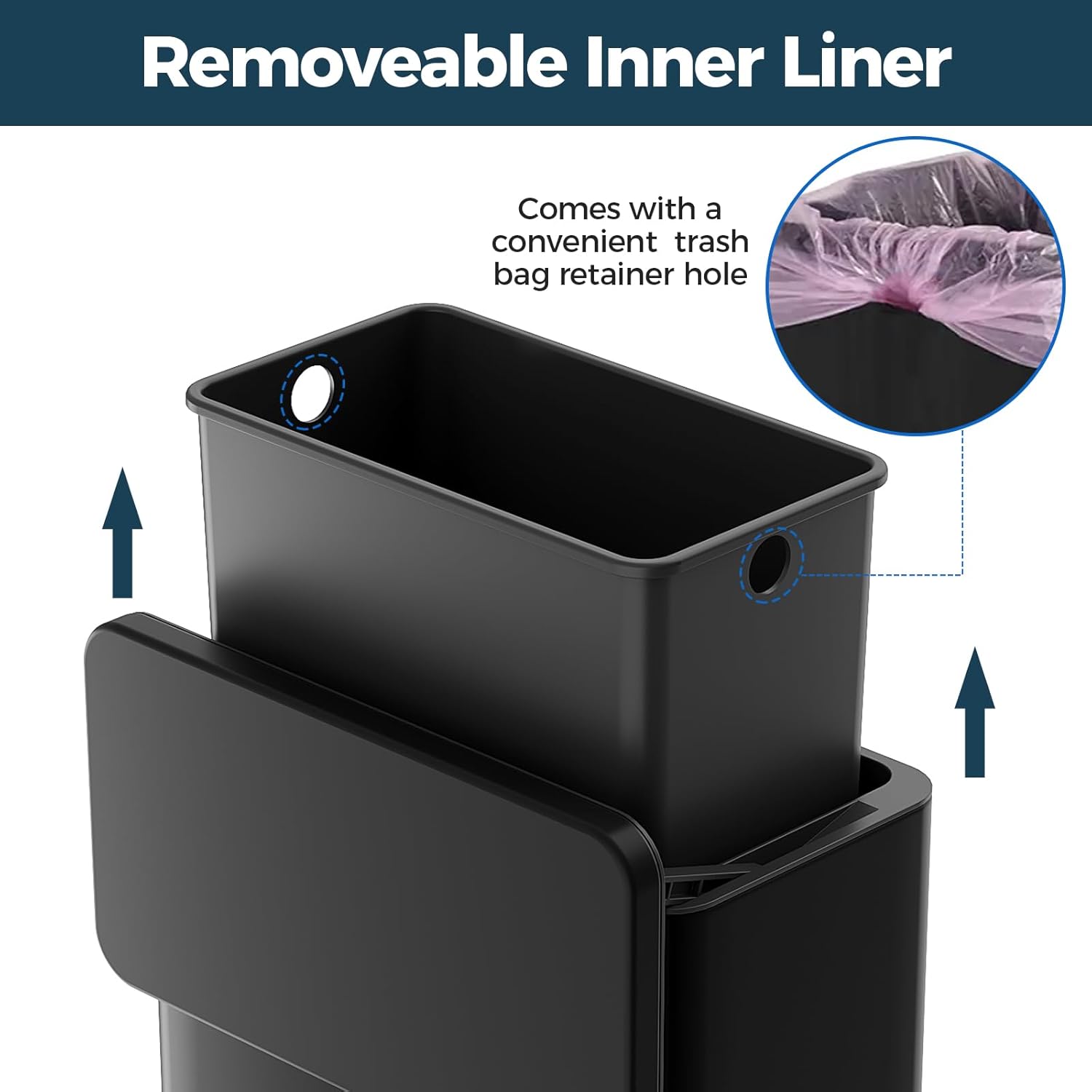 - Removeable Plastic Inner Liner - It is easy to remove for dumping the garbage or cleaning. Waste will not touch the stainless steel outer bin, preventing rusting and leaking. The retainer hole of the inner trash can helps keep the garbage bags from sliding down and looks more tidy.