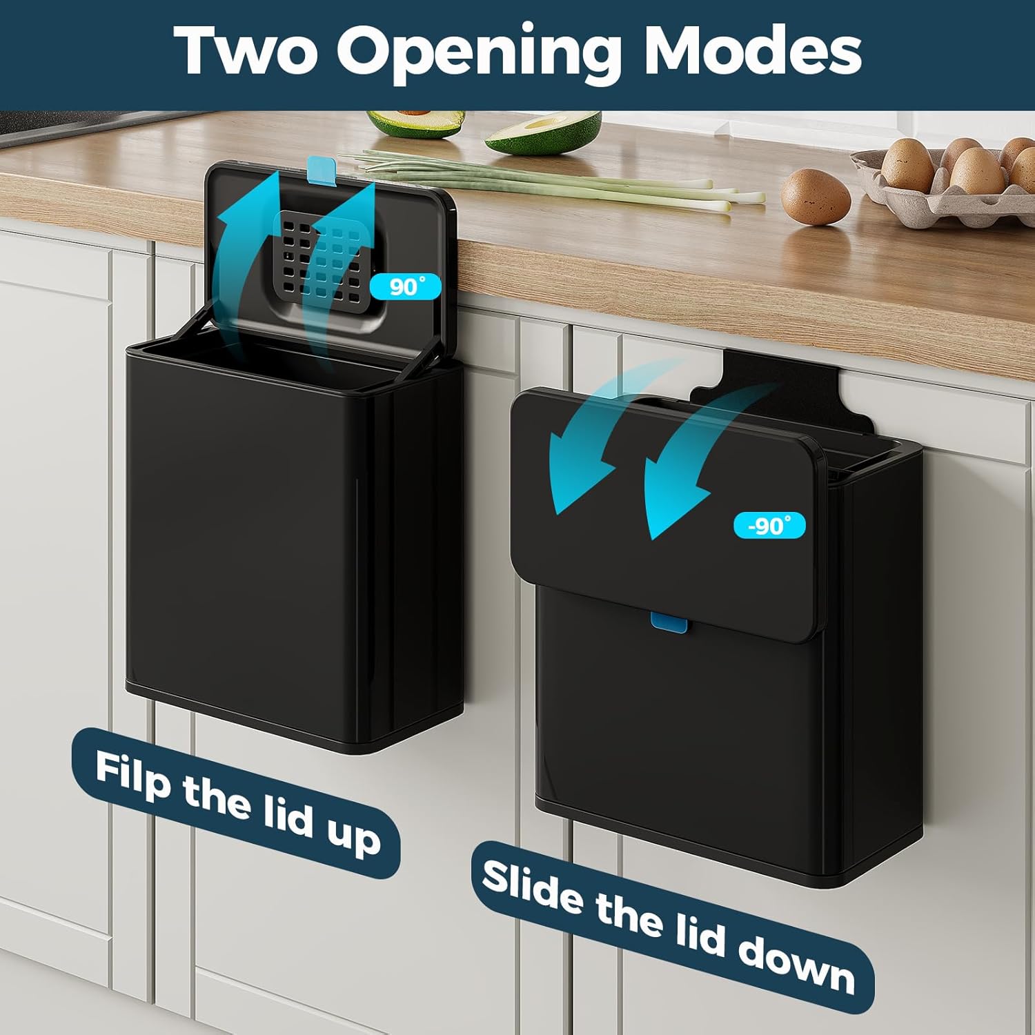 - Two Opening Modes - Flip up the lid or Slide the lid down, Come with a comfortable silicone carrying handle allows you to dispose of the waste quickly and cleanly with a simple pull or slide, depending on your habits and position.