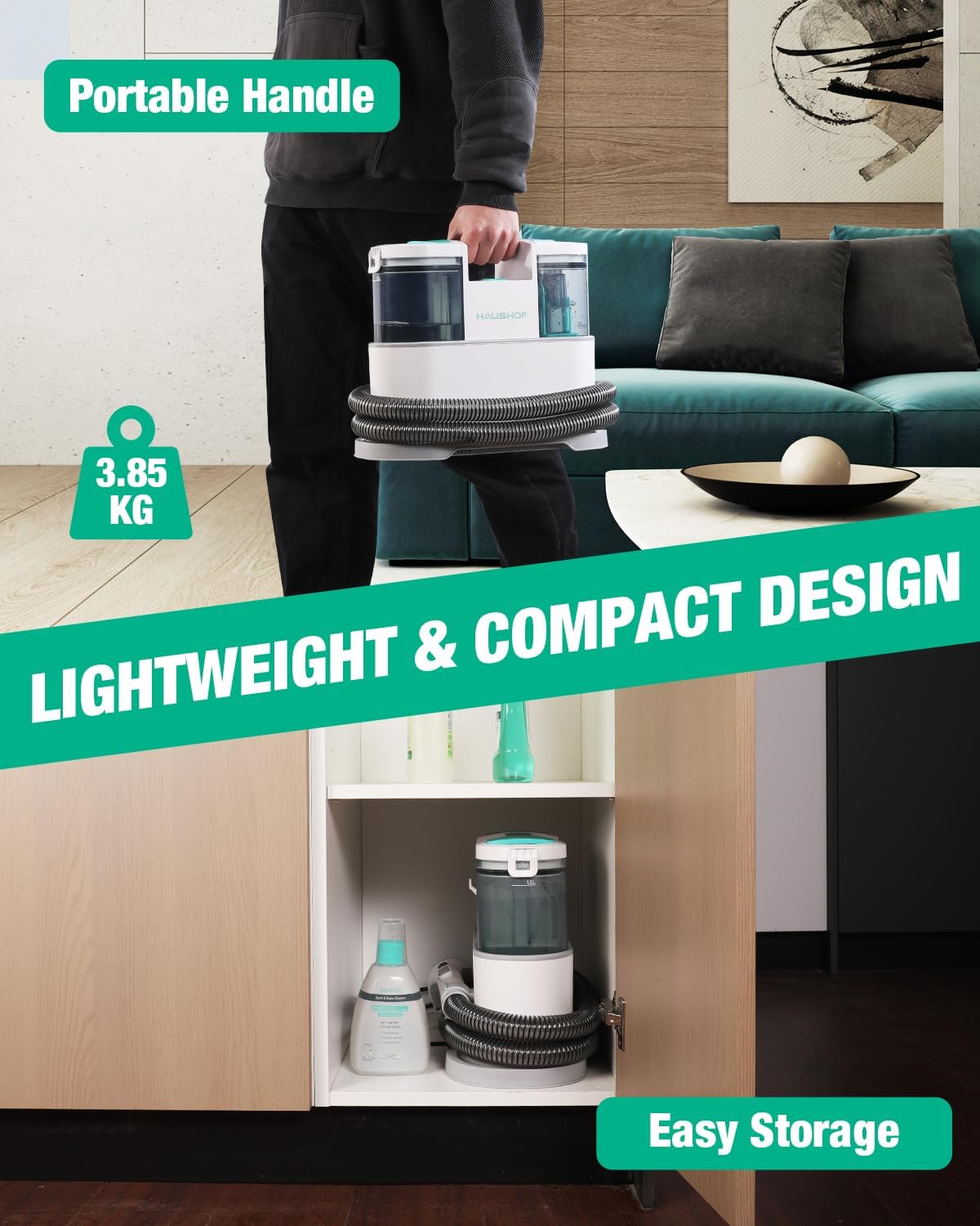 - Lightweight and Compact Design: Weighing only 8.5 lbs, this couch cleaner is easily portable. The ergonomic top handle makes portable carpet cleaner easy for you to carry couch cleaner machine around the living room, bedroom, up the stairs, and to your car as well. Its compact size makes it easy to store anywhere