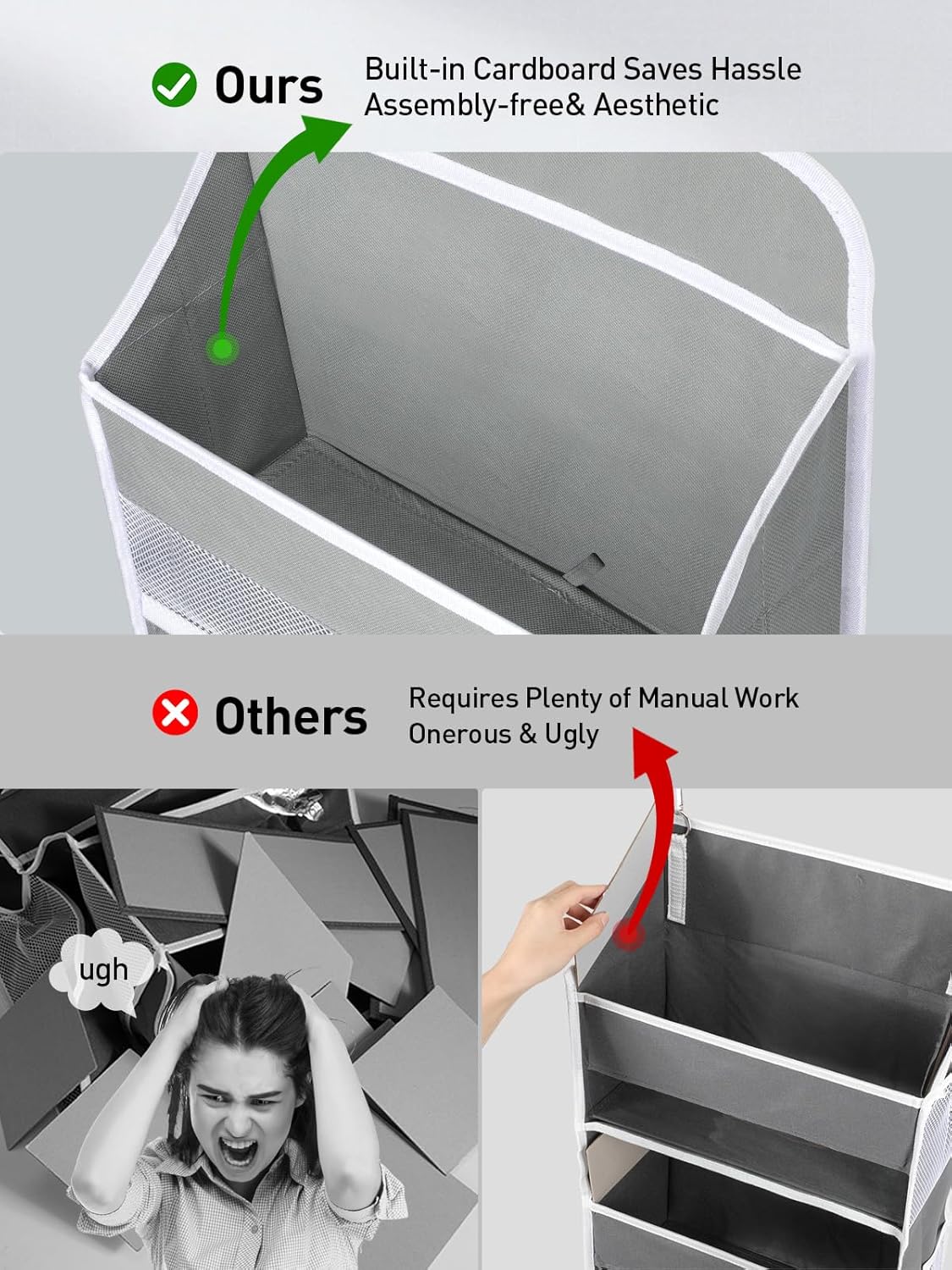- Tool-free Assembly Within Seconds: No need to insert cardboard in the pockets as required by other bathroom storage shelves! We have it pre-inserted in the pockets to cut your hassle. Simply hang, put the cardboard in the bin's bottom, and done! Definitely a good pickup for anyone on a budget wanting to update organization and storage for extra storage