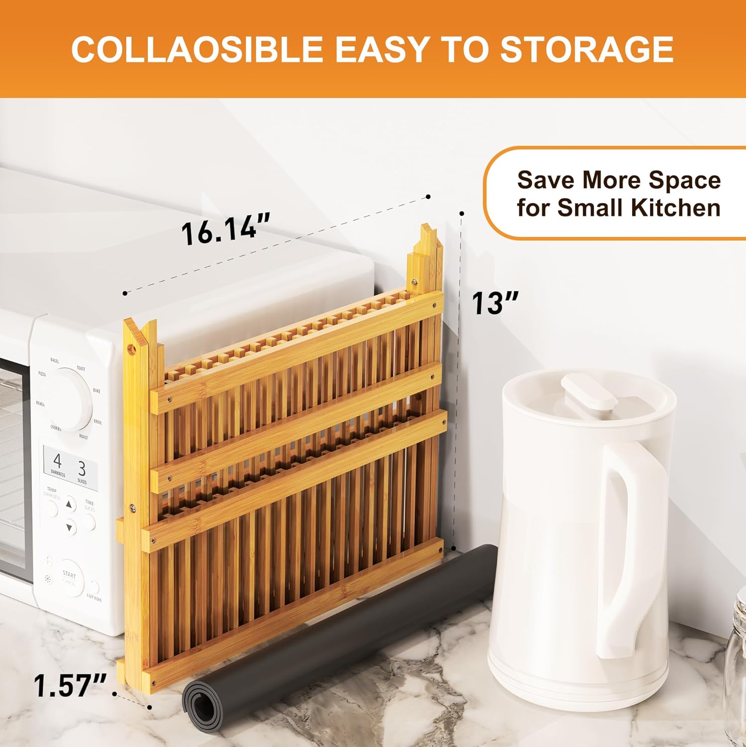 - Large Capacity: This beautifully bamboo dish drying rack for kitchen counter accommodates your complete dishes set - including dinner plates, cups, forks, and spoons. Keep your counter tidy and not cluttered. A foldable dish drying rack allows you to efficiently dry your dishes, mugs, pots and pans. dish racks for kitchen counter designed for maximum capacity and ultra-convenience. 2 tiers and 18 slots are perfect for 18 full-size square or round plates, cups, and even a cutting board