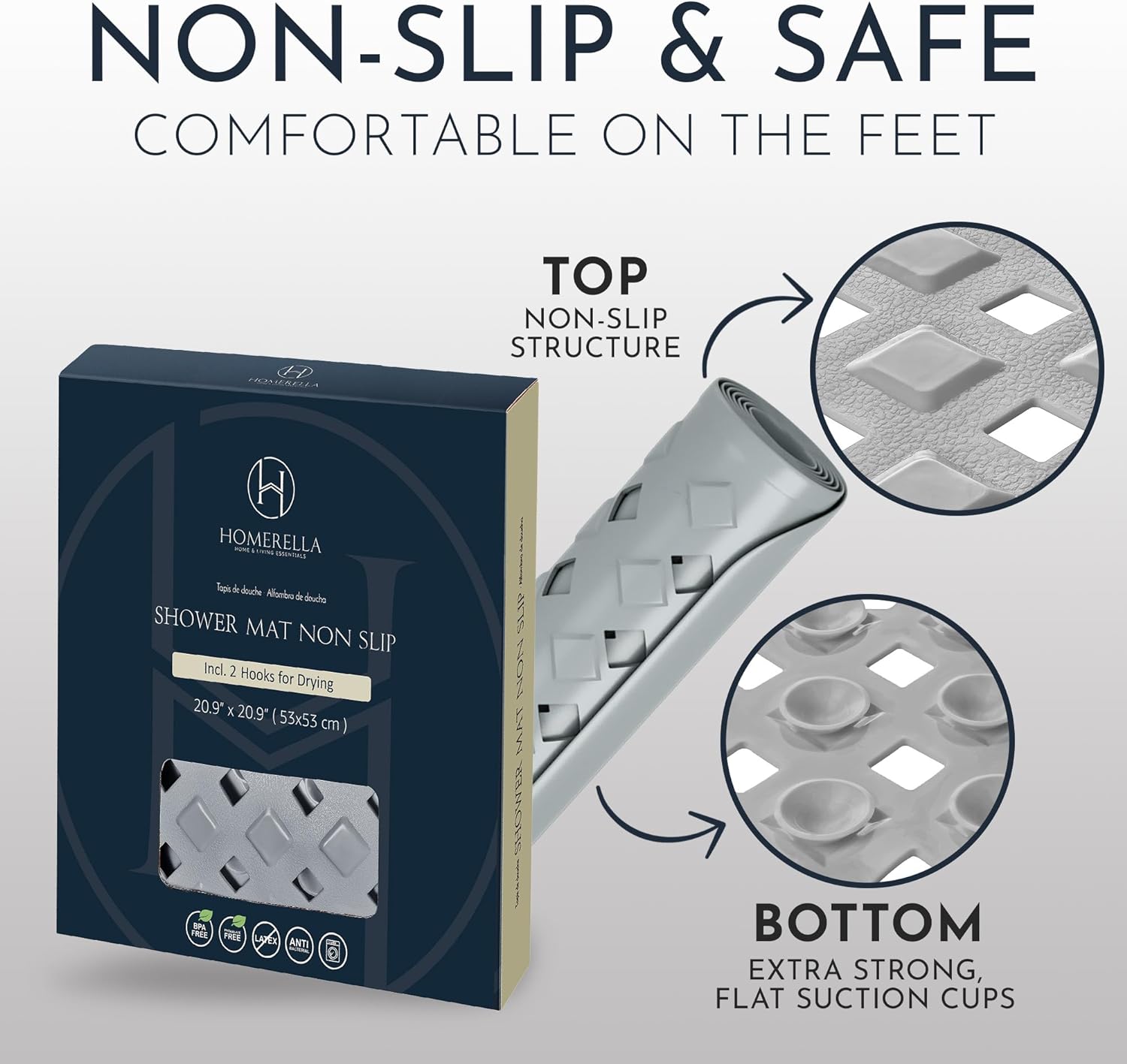 - Non-slip? Safe & Secure - The Homerella shower mat non slip anti square has over 250 anti-slip suction cups on the bottom for optimum grip. The top of the shower drying mat has a special anti-slip structure!