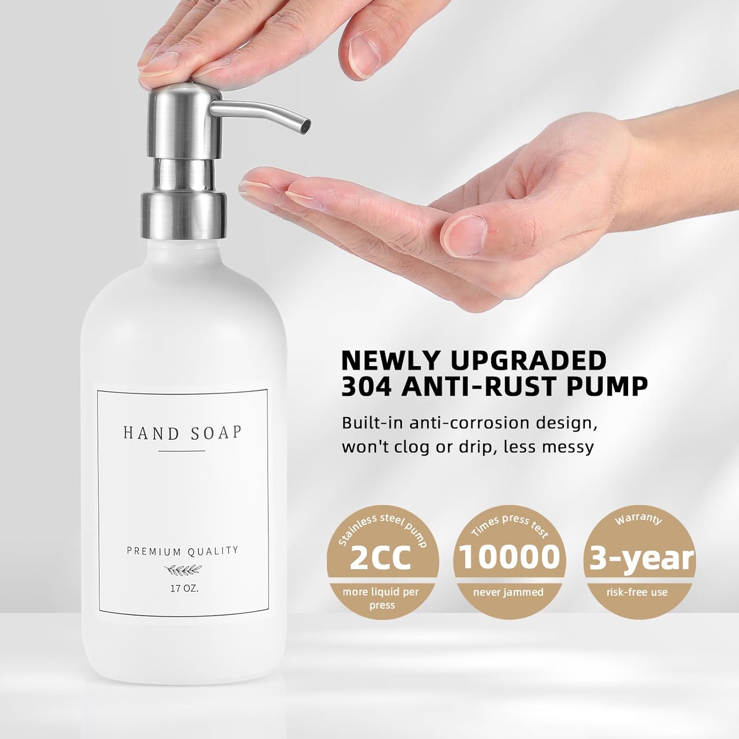 - A practical and aesthetically pleasing addition to your home: This soap dispenser set contains 2 reinforced hard glass bottles with sleek and stylish stainless steel pump heads for your liquid soap; hand soap, dish soap, hand lotion, body wash, shampoo, conditioner labels, 1 silicone funnel, 1 waterproof non-slip tray, this set has transformed mundane routines into moments of indulgence and style.