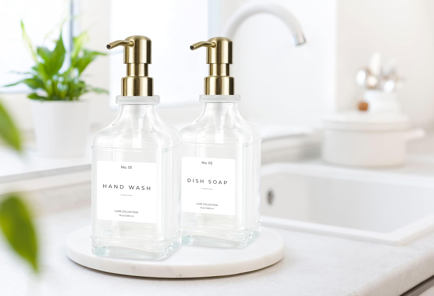 Emerson Essentials Soap Dispenser, Dish Soap Dispenser, Soap Bottle Set, Hand Soap Dispenser, Kitchen Soap Dispenser Set, Glass Soap Dispenser with Pump and Labels, 16 Oz, 2 Pack, Farmhouse